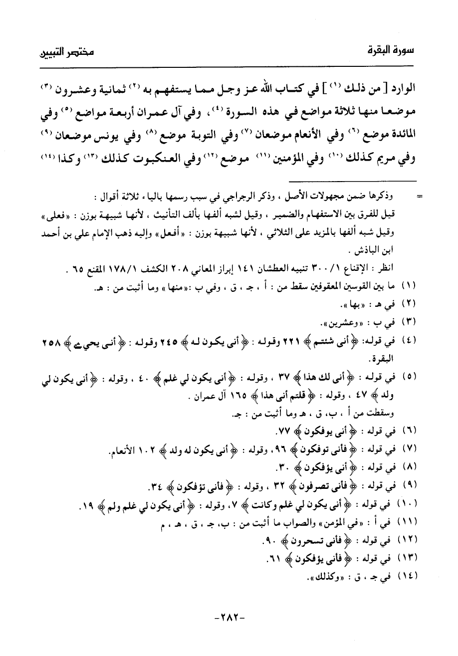 الوارد [من ذلك (¬1)] في كتاب الله عز وجل مما يستفهم به (¬2) ثمانية وعشرون (¬3) موضعا منها ثلاثة مواضع في هذه السورة (¬4)، وفي آل عمران أربعة مواضع (¬5) وفي المائدة موضع (¬6) وفي الأنعام موضعان (¬7) وفي التوبة موضع (¬8) وفي يونس موضعان (¬9) وفي مريم كذلك (¬10) وفي المؤمنين (¬11) موضع (¬12) وفي العنكبوت كذلك (¬13) وكذا (¬14)