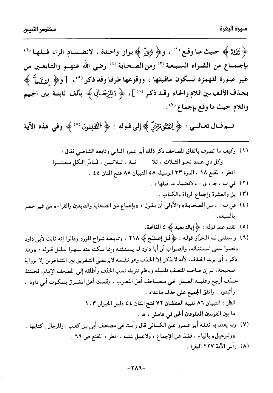 (¬6) واستثني له الخرّاز قوله: قل إصلح 218، وتابعه شراح المورد وقالوا إنه ثابت لأبي داود ونصوا على استثنائه، والصواب أن أبا داود لم يستثنه وإنما سكت عنه سهوا بدليل قوله: «وقد ذكر» أي يريد الحذف، لأنه لا يذكر إلا الحذف وهو نفسه لا يرتضي التفريق بين المتناظرين إلا برواية صحيحة، ثم إن صاحب المنصف تلميذه وناظم تنزيله نسب الحذف وأطلقه إلى المصحف الإمام، فحينئذ الحذف أرجح وعليه العمل في مصاحف أهل المغرب، وتمسك أهل المشرق بسكوت أبي داود، وأثبتوه، واتفق الجميع على حذف ما عداه.