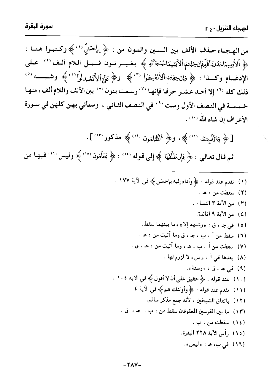 ألّا يقيما حدود الله فإن خفتم ألّا يقيما حدود الله بغير نون قبل اللام ألف (¬2) على الإدغام وكذا: وإن خفتم ألّا تقسطوا (¬3) وعلى ألّا تعدلوا (¬4) وشبه (¬5) ذلك كله (¬6) إلا أحد عشر حرفا فإنها (¬7) رسمت بنون (¬8) بين الألف واللام ألف، منها خمسة في النصف الأول وست (¬9) في النصف الثاني، وسنأتي بهن كلهن في سورة الأعراف إن شاء الله (¬10).