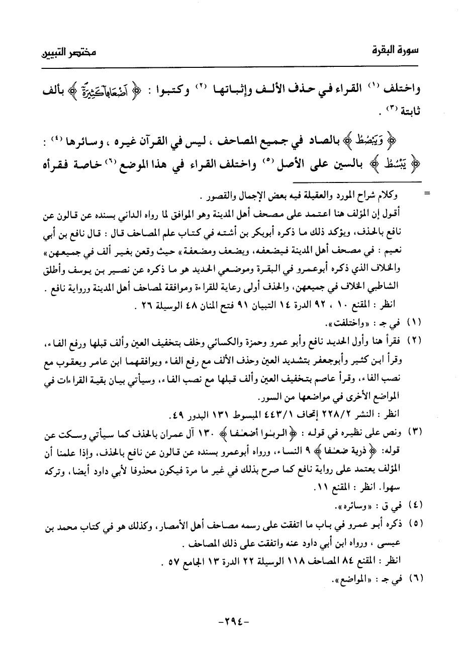 (¬3) ونص على نظيره في قوله: الربوا أضعفا 130 آل عمران بالحذف كما سيأتي وسكت عن قوله: ذرية ضعفا 9 النساء، ورواه أبو عمرو بسنده عن قالون عن نافع بالحذف، وإذا علمنا أن المؤلف يعتمد على رواية نافع كما صرح بذلك في غير ما مرة فيكون محذوفا لأبي داود أيضا، وتركه سهوا. انظر: المقنع 11.