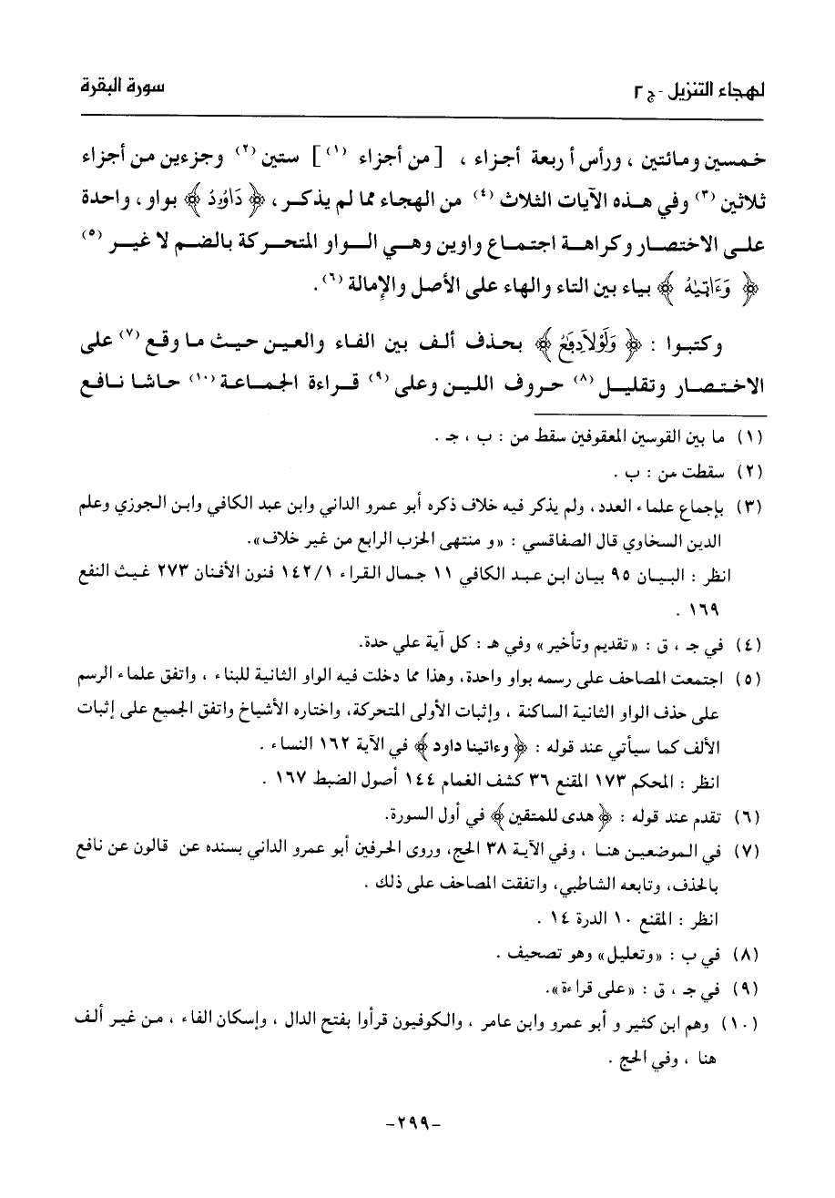 خمسين ومائتين، ورأس أربعة أجزاء، [من أجزاء (¬1)] ستين (¬2) وجزءين من أجزاء ثلاثين (¬3) وفي هذه الآيات الثلاث (¬4) من الهجاء مما لم يذكر، داود بواو، واحدة على الاختصار وكراهة اجتماع واوين وهي الواو المتحركة بالضم لا غير (¬5) وءاتيه بياء بين التاء والهاء على الأصل والإمالة (¬6).