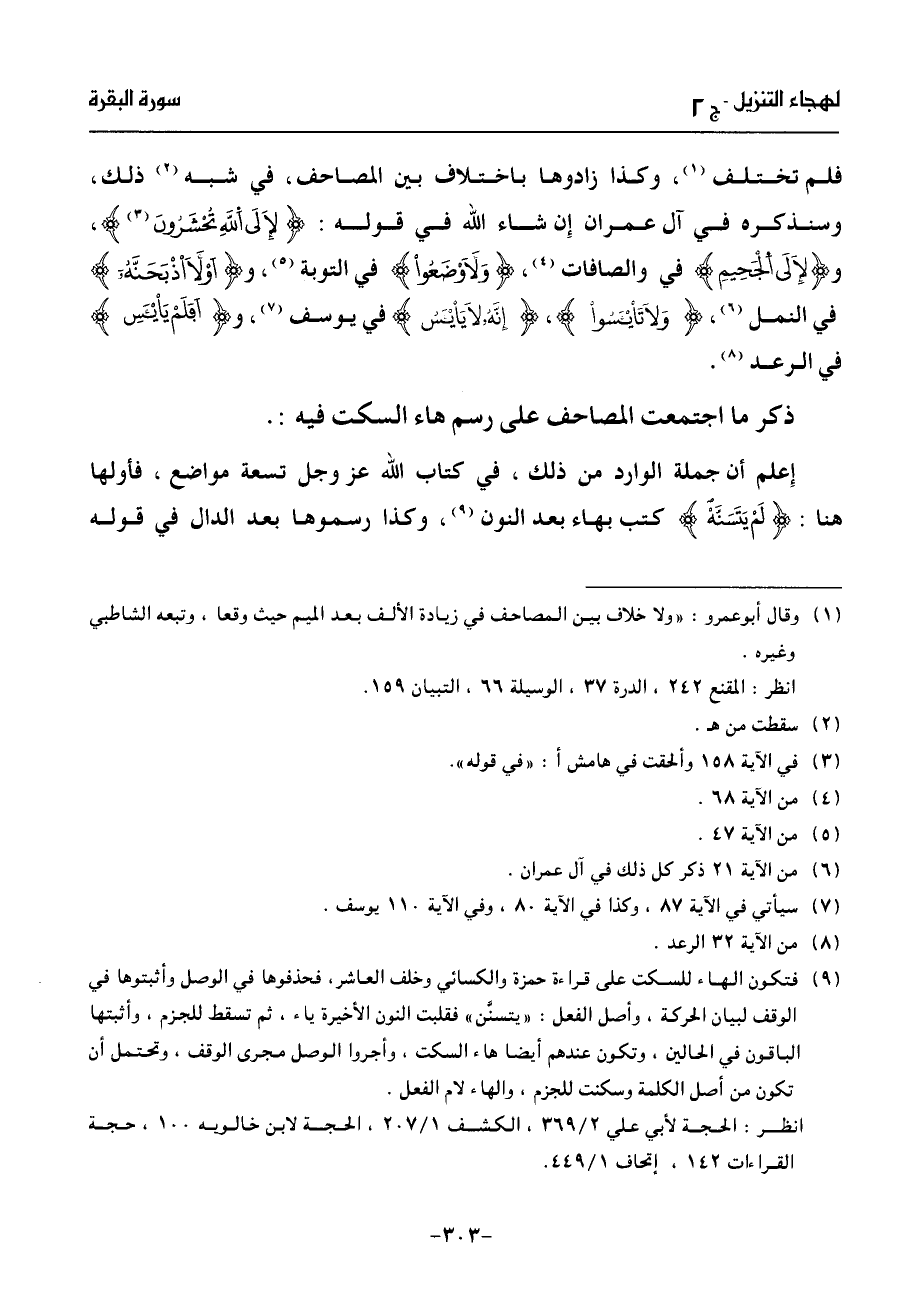 اعلم أن جملة الوارد من ذلك، في كتاب الله عز وجل تسعة مواضع، فأولها هنا: لم يتسنّه كتب بهاء بعد النون (¬9)، وكذا رسموها بعد الدال في قوله