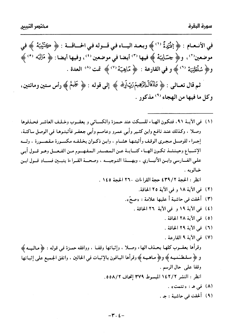 في الأنعام: اقتده (¬1) وبعد الياء في قوله في الحاقة: كتبيه في موضعين (¬2)، وحسابيه فيها (¬3) أيضا في موضعين (¬4)، وفيها أيضا: ماليه (¬5) وسلطنيه (¬6) وفي القارعة: ماهيه (¬7) تمت (¬8) العدة.