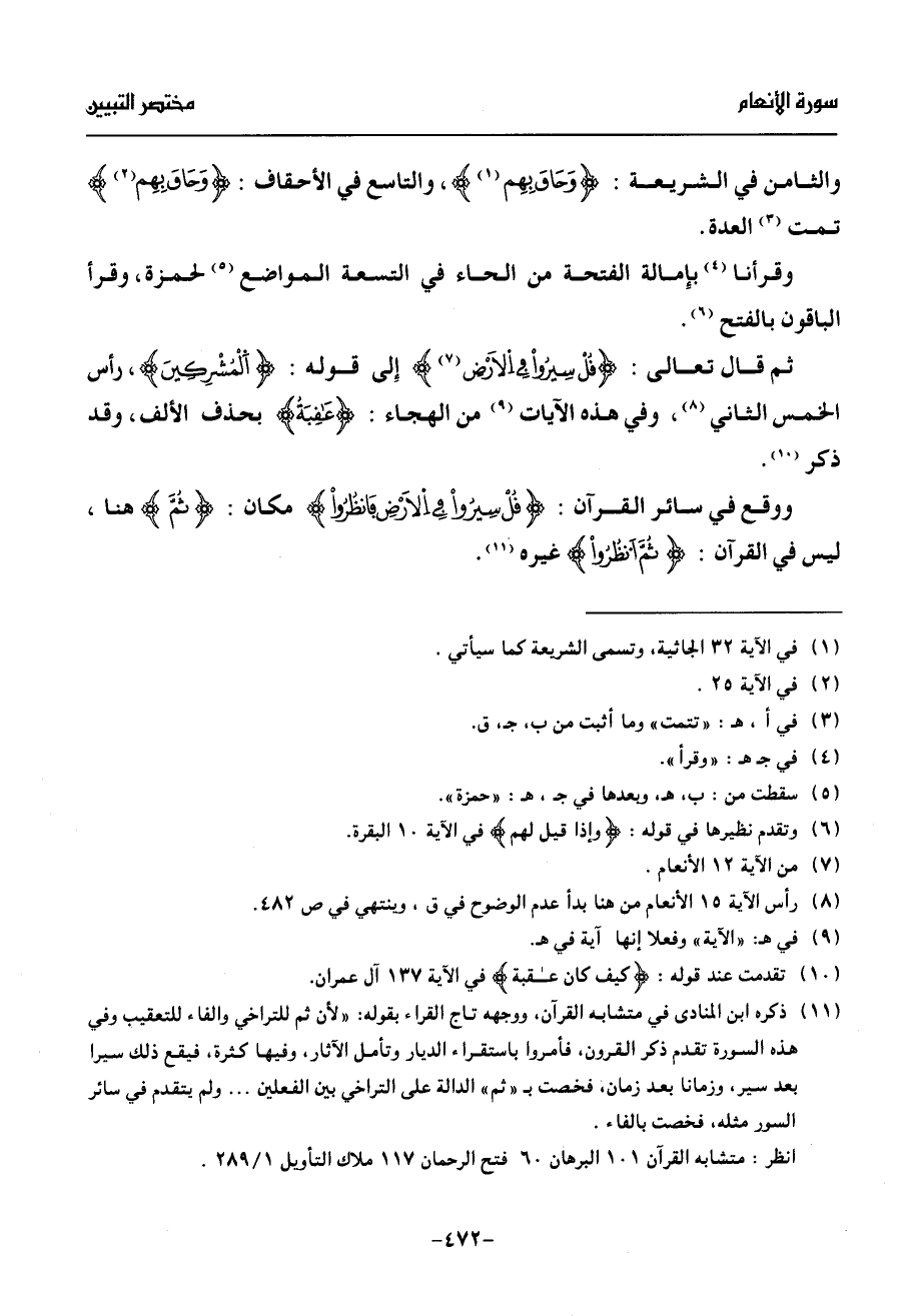 (¬11) ذكره ابن المنادى في متشابه القرآن، ووجهه تاج القراء بقوله: «لأن ثم للتراخي والفاء للتعقيب وفي هذه السورة تقدم ذكر القرون، فأمروا باستقراء الديار وتأمل الآثار، وفيها كثرة، فيقع ذلك سيرا بعد سير، وزمانا بعد زمان، فخصت ب «ثم» الدالة على التراخي بين الفعلين ... ولم يتقدم في سائر السور مثله، فخصت بالفاء.