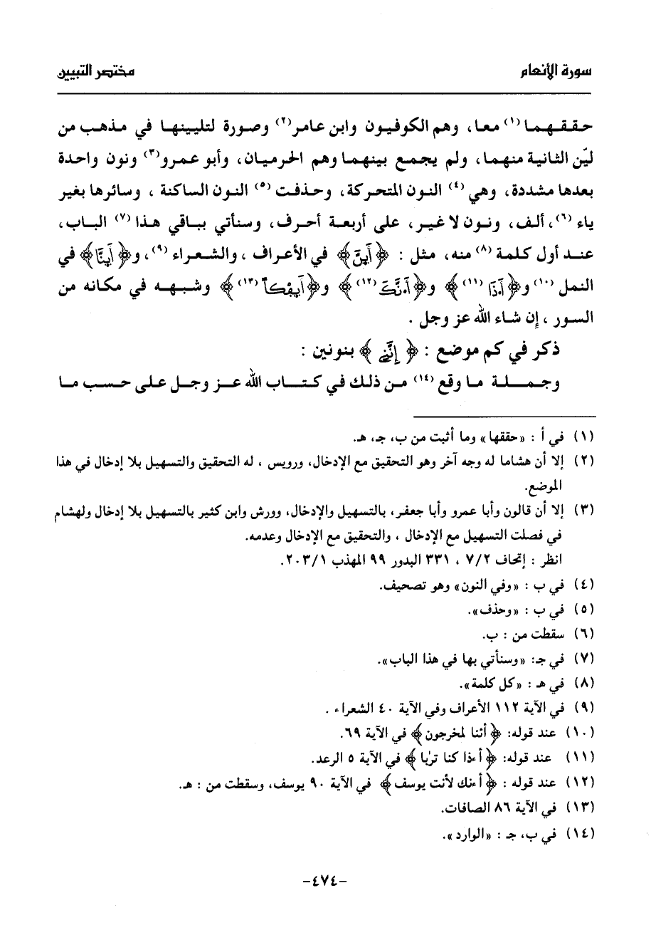 حققهما (¬1) معا، وهم الكوفيون وابن عامر (¬2) وصورة لتليينها في مذهب من ليّن الثانية منهما، ولم يجمع بينهما وهم الحرميان، وأبو عمرو (¬3) ونون واحدة بعدها مشددة، وهي (¬4) النون المتحركة، وحذفت (¬5) النون الساكنة، وسائرها بغير ياء (¬6)، ألف، ونون لا غير، على أربعة أحرف، وسنأتي بباقي هذا (¬7) الباب، عند أول كلمة (¬8) منه، مثل: أينّ في الأعراف، والشعراء (¬9)، وأبنّا في النمل (¬10) وأذا (¬11) وأنّك (¬12) وأيفكا (¬13) وشبهه في مكانه من السور، إن شاء الله عز وجل.