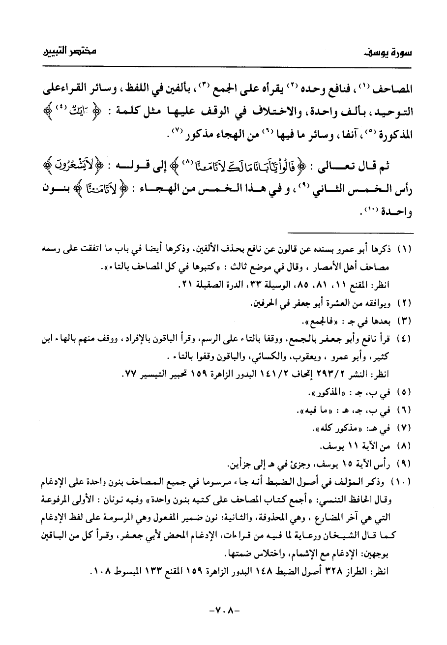 (¬10) وذكر المؤلف في أصول الضبط أنه جاء مرسوما في جميع المصاحف بنون واحدة على الإدغام وقال الحافظ التنسي: «أجمع كتاب المصاحف على كتبه بنون واحدة» وفيه نونان: الأولى المرفوعة التي هي آخر المضارع، وهي المحذوفة، والثانية: نون ضمير المفعول وهي المرسومة على لفظ الإدغام كما قال الشيخان ورعاية لما فيه من قراءات، الإدغام المحض لأبي جعفر، وقرأ كل من الباقين بوجهين: الإدغام مع الإشمام، واختلاس ضمتها.