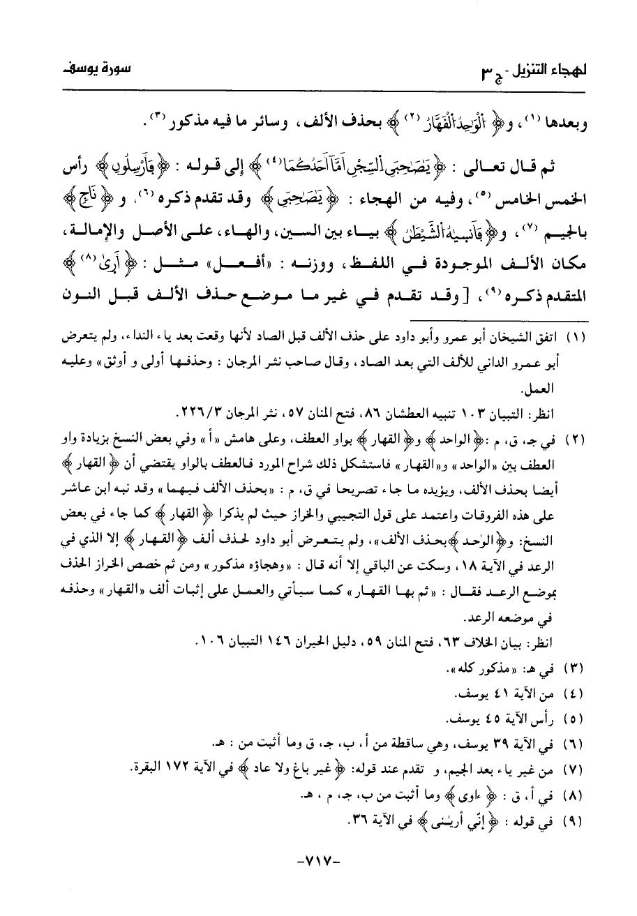 (¬1) اتفق الشيخان أبو عمرو وأبو داود على حذف الألف قبل الصاد لأنها وقعت بعد ياء النداء، ولم يتعرض أبو عمرو الداني للألف التي بعد الصاد، وقال صاحب نثر المرجان: وحذفها أولى وأوثق» وعليه العمل.