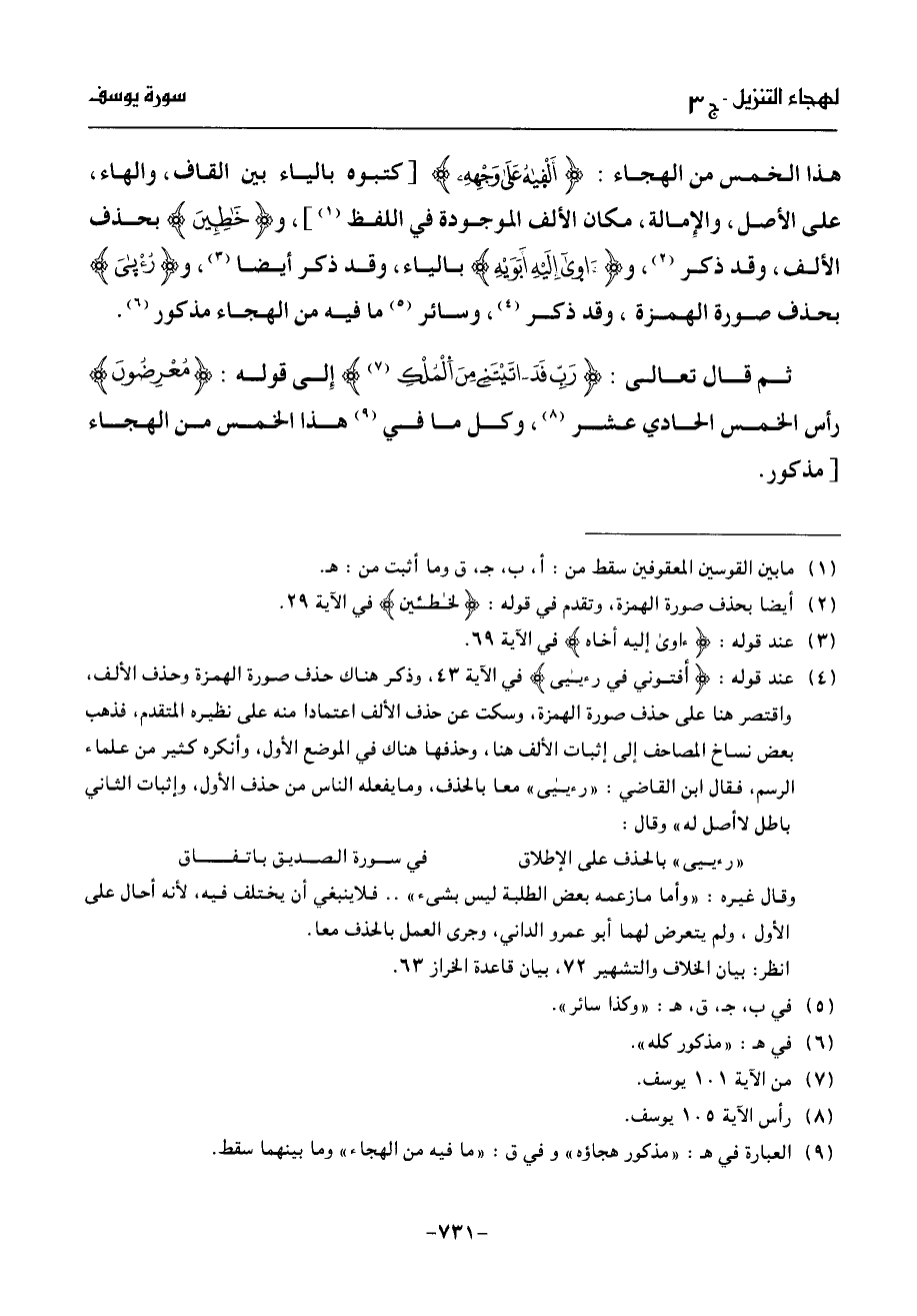 (¬4) عند قوله: أفتوني في رءييى في الآية 43، وذكر هناك حذف صورة الهمزة وحذف الألف، واقتصر هنا على حذف صورة الهمزة، وسكت عن حذف الألف اعتمادا منه على نظيره المتقدم، فذهب بعض نساخ المصاحف إلى إثبات الألف هنا، وحذفها هناك في الموضع الأول، وأنكره كثير من علماء الرسم، فقال ابن القاضي: «رءيي» معا بالحذف، وما يفعله الناس من حذف الأول، وإثبات الثاني باطل لا أصل له» وقال: