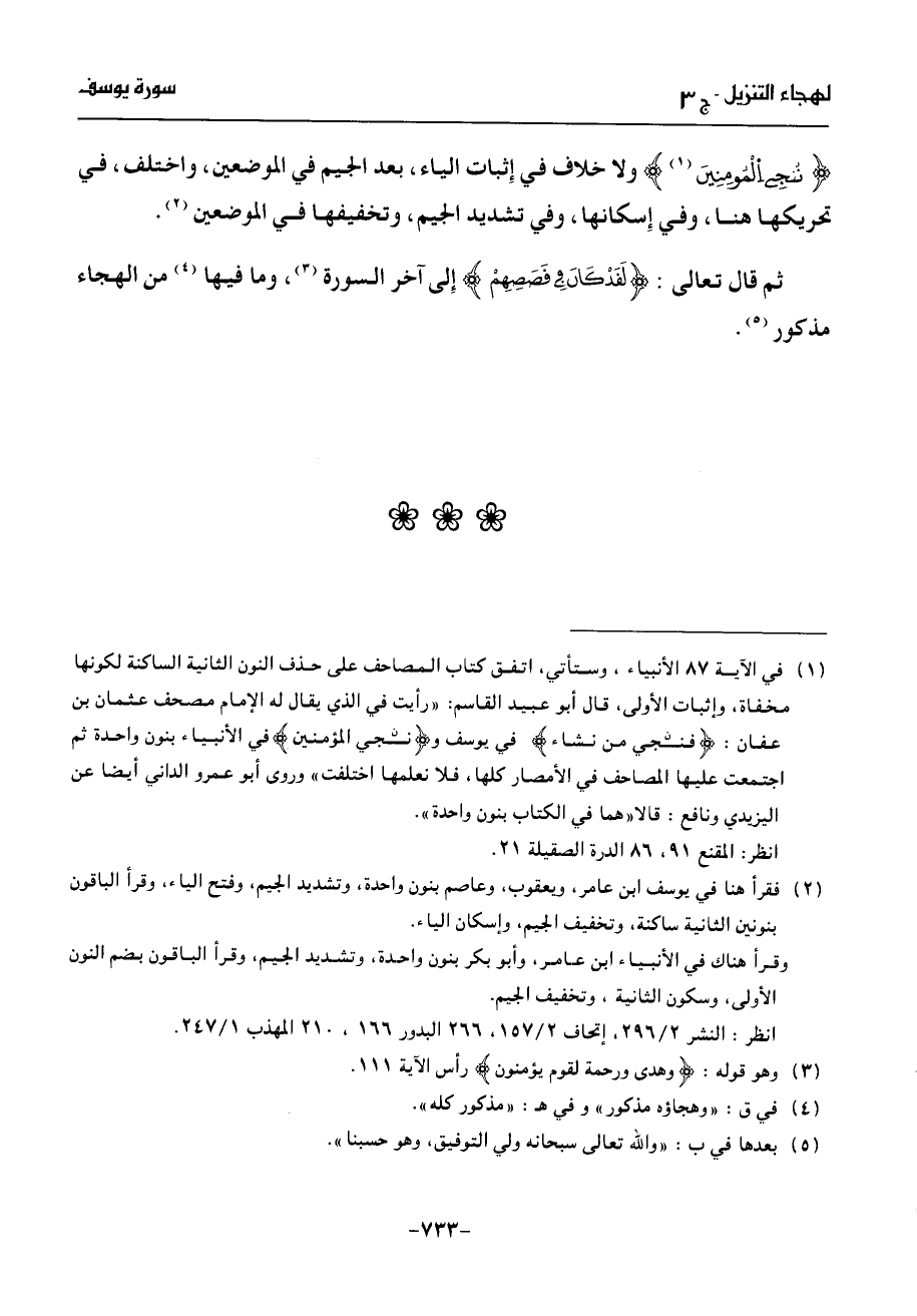 (¬1) في الآية 87 الأنبياء، وستأتي، اتفق كتاب المصاحف على حذف النون الثانية الساكنة لكونها مخفاة، وإثبات الأولى، قال أبو عبيد القاسم: «رأيت في الذي يقال له الإمام مصحف عثمان بن عفان: فنجي من نشاء في يوسف ونجي المؤمنين في الأنبياء بنون واحدة ثم اجتمعت عليها المصاحف في الأمصار كلها، فلا نعلمها اختلفت» وروى أبو عمرو الداني أيضا عن اليزيدي ونافع: قالا «هما في الكتاب بنون واحدة».