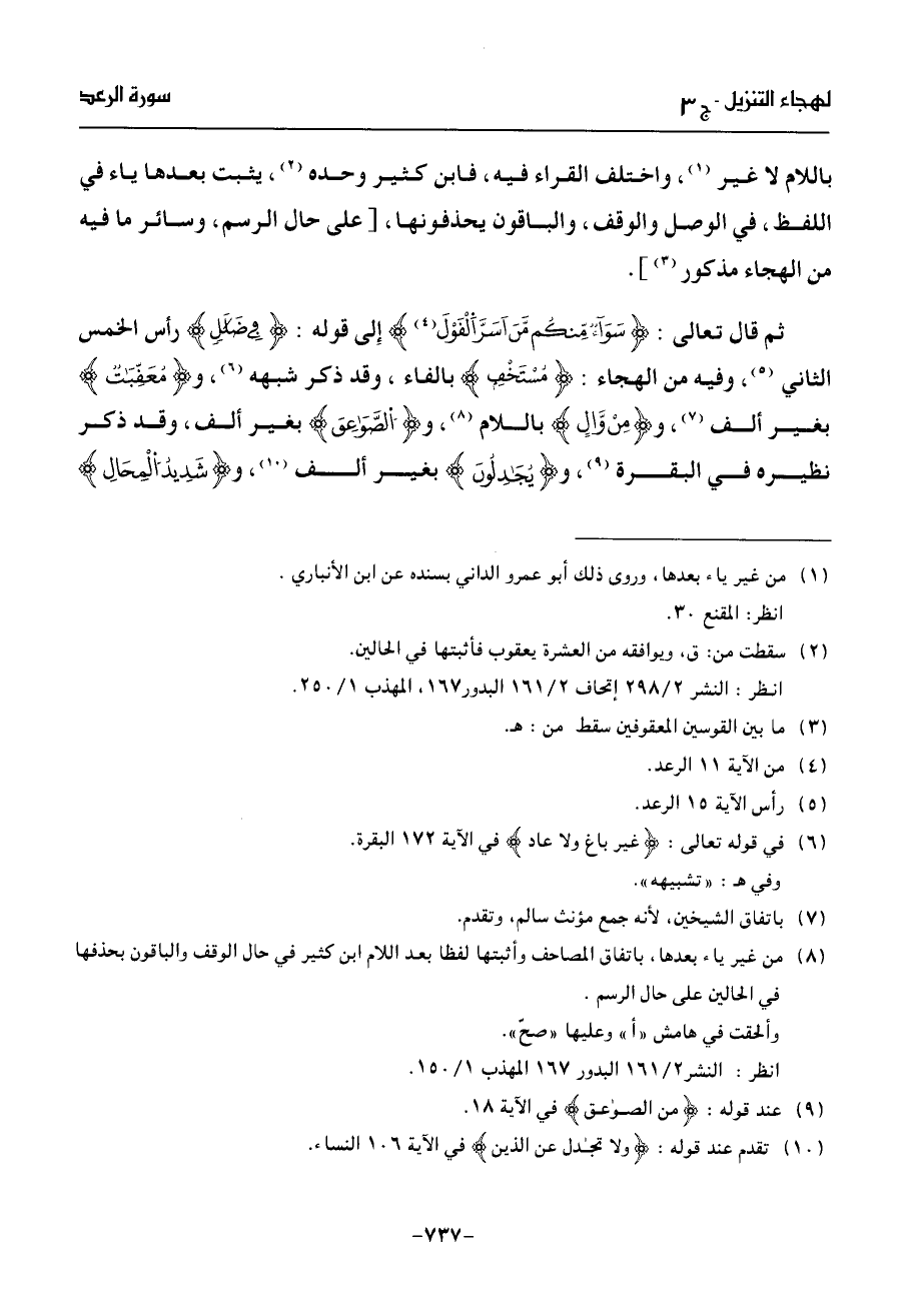 ثم قال تعالى: سوآء مّنكم مّن اسرّ الفول (¬4) إلى قوله: فى ضلل رأس الخمس الثاني (¬5)، وفيه من الهجاء: مستخف بالفاء، وقد ذكر شبهه (¬6)، ومعفّبت بغير ألف (¬7)، ومن وّال باللام (¬8)، والصّوعق بغير ألف، وقد ذكر نظيره في البقرة (¬9)، ويجدلون بغير ألف (¬10)، وشديد المحال