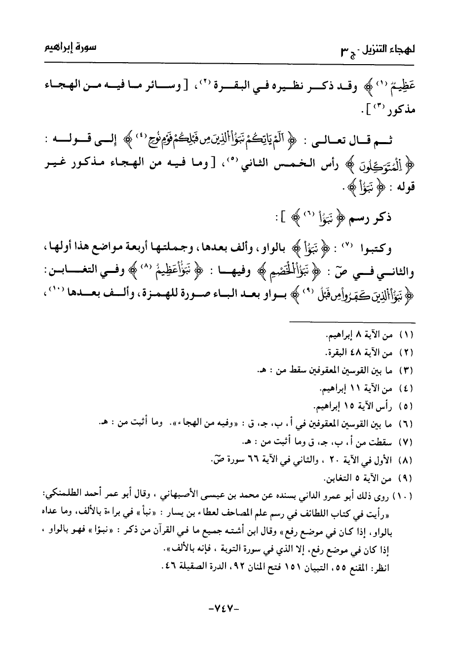 وكتبوا (¬7): نبؤا بالواو، وألف بعدها، وجملتها أربعة مواضع هذا أولها، والثاني في ص: نبؤا الخصم وفيها: نبؤا عظيم (¬8) وفي التغابن: