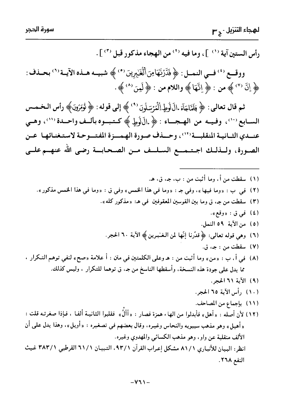 ثم قال تعالى: فلمّا جآء ال لوط المرسلون (¬9) إلى قوله: تومرون رأس الخمس السابع (¬10)، وفيه من الهجاء: ال لوط كتبوه بألف واحدة (¬11)، وهي عندي الثانية المنقلبة (¬12)، وحذف صورة الهمزة المفتوحة لاستغنائها عن الصورة، ولذلك اجتمع السلف من الصحابة رضى الله عنهم على