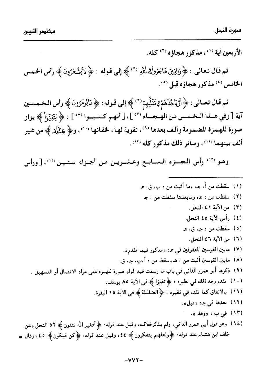 (¬14) وهو قول أبي عمرو الداني، ولم يذكر خلافه، وقيل عند قوله: أفغير الله تتقون 52 النحل وعن خلف ابن هشام عند قوله: ولعلهم يتفكرون 44، وقيل عند قوله: كن فيكون 45، وقال-