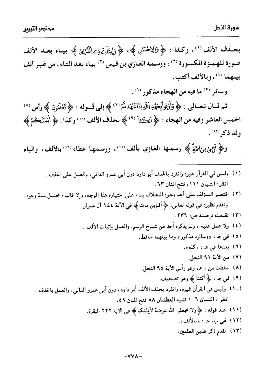بحذف الألف (¬1)، وكذا: والاحسن، وإيتآءى ذى الفربى بياء بعد الألف صورة للهمزة المكسورة (¬2)، ورسمه الغازي بن قيس (¬3) بياء بعد التاء، من غير ألف بينهما (¬4)، وبالألف أكتب.