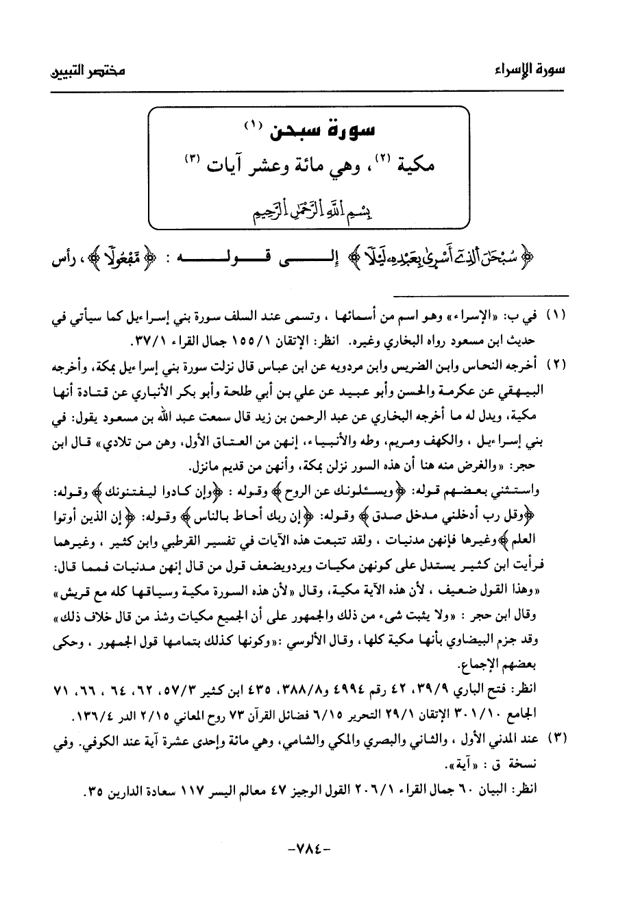 (¬2) أخرجه النحاس وابن الضريس وابن مردويه عن ابن عباس قال نزلت سورة بني إسراءيل بمكة، وأخرجه البيهقي عن عكرمة والحسن وأبو عبيد عن علي بن أبي طلحة وأبو بكر الأنباري عن قتادة أنها مكية، ويدل له ما أخرجه البخاري عن عبد الرحمن بن زيد قال سمعت عبد الله بن مسعود يقول: في بني إسراءيل، والكهف ومريم، وطه والأنبياء، إنهن من العتاق الأول، وهن من تلادي» قال ابن حجر: «والغرض منه هنا أن هذه السور نزلن بمكة، وأنهن من قديم ما نزل.