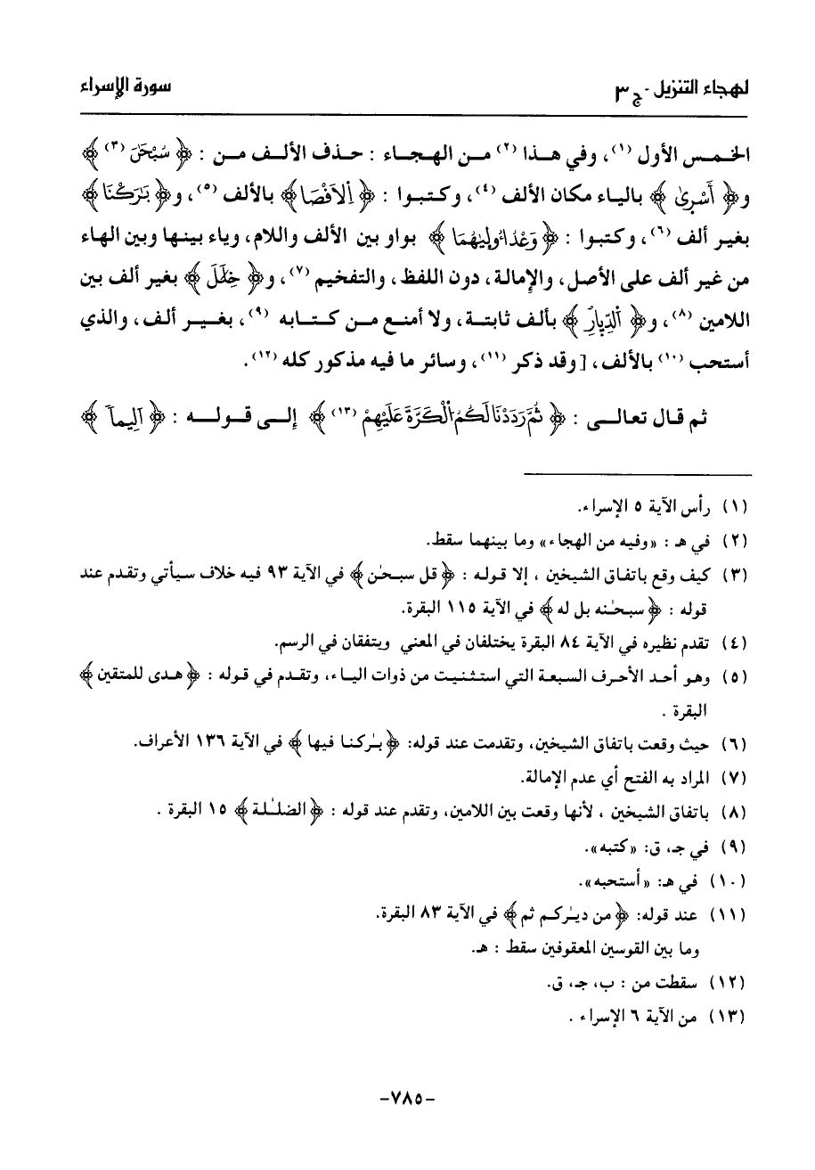 الخمس الأول (¬1)، وفي هذا (¬2) من الهجاء: حذف الألف من: سبحن (¬3) وأسرى بالياء مكان الألف (¬4)، وكتبوا: الافصا بالألف (¬5)، وبركنا بغير ألف (¬6)، وكتبوا: وعد اءوليهما بواو بين الألف واللام، وياء بينها وبين الهاء من غير ألف على الأصل، والإمالة، دون اللفظ، والتفخيم (¬7)، وخلل بغير ألف بين اللامين (¬8)، والدّيار بألف ثابتة، ولا أمنع من كتابه (¬9)، بغير ألف، والذي أستحب (¬10) بالألف، [وقد ذكر (¬11)، وسائر ما فيه مذكور كله (¬12).