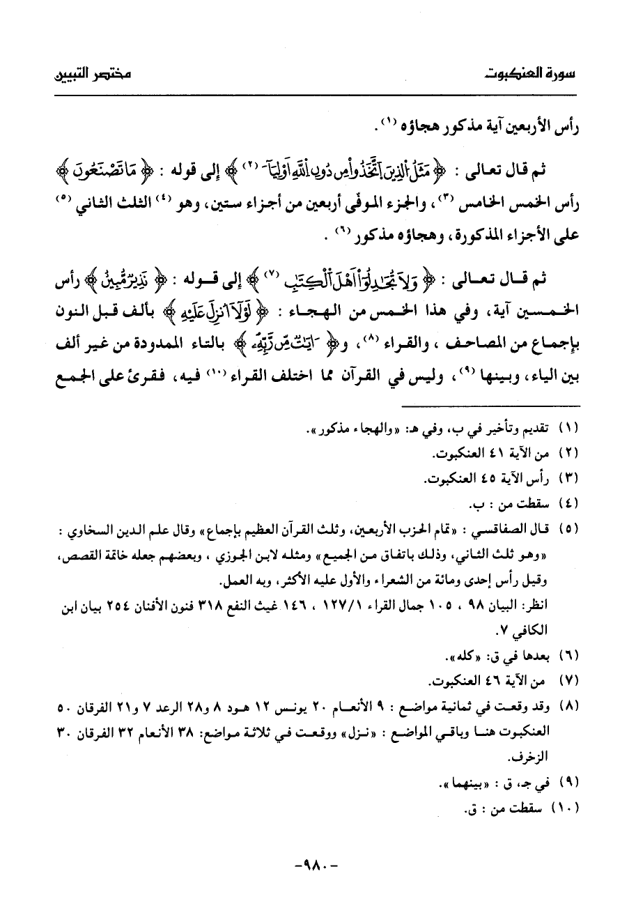 ثم قال تعالى: ولا تجدلوا أهل الكتب (¬7) إلى قوله: نذير مّبين رأس الخمسين آية، وفي هذا الخمس من الهجاء: لولا أنزل عليه بألف قبل النون بإجماع من المصاحف، والقراء (¬8)، وءايت مّن رّبّه بالتاء الممدودة من غير ألف بين الياء، وبينها (¬9)، وليس في القرآن مما اختلف القراء (¬10) فيه، فقرئ على الجمع