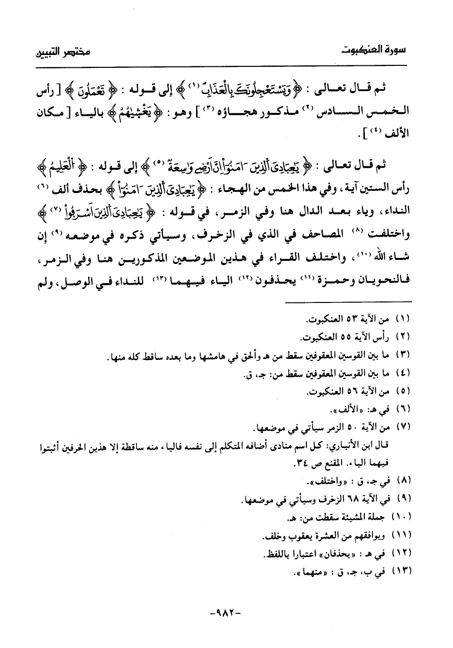 ثم قال تعالى: يعبادى الذين ءامنوا إنّ أرضى وسعة (¬5) إلى قوله: العليم رأس الستين آية، وفي هذا الخمس من الهجاء: يعبادى الذين ءامنوا بحذف ألف (¬6) النداء، وياء بعد الدال هنا وفي الزمر، في قوله: يعبادى الذين أسرفوا (¬7) واختلفت (¬8) المصاحف في الذي في الزخرف، وسيأتي ذكره في موضعه (¬9) إن شاء الله (¬10)، واختلف القراء في هذين الموضعين المذكورين هنا وفي الزمر، فالنحويان وحمزة (¬11) يحذفون (¬12) الياء فيهما (¬13) للنداء في الوصل، ولم