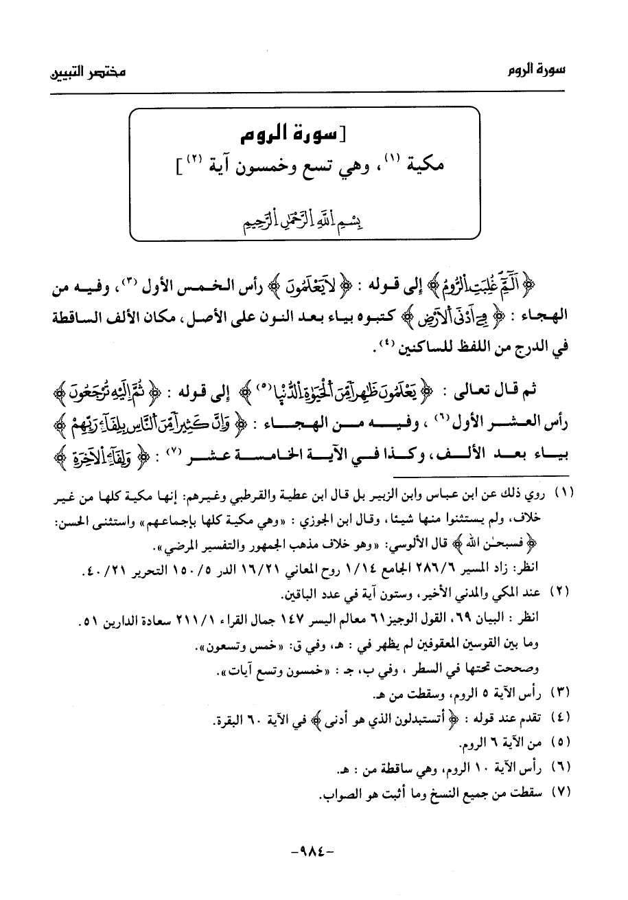 [سورة الروم مكية (¬1)، وهي تسع وخمسون آية (¬2)] بسم الله الرّحمن الرّحيم ألمّ غلبت الرّوم إلى قوله: لا يعلمون رأس الخمس الأول (¬3)، وفيه من الهجاء: فى أدنى الارض كتبوه بياء بعد النون على الأصل، مكان الألف الساقطة في الدرج من اللفظ للساكنين (¬4).