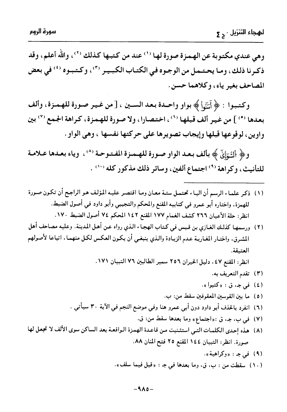(¬1) ذكر علماء الرسم أن الياء تحتمل ستة معان وما اقتصر عليه المؤلف هو الراجح أن تكون صورة للهمزة، واختاره أبو عمرو في كتابيه المقنع والمحكم والتجيبي وأبو داود في أصول الضبط.