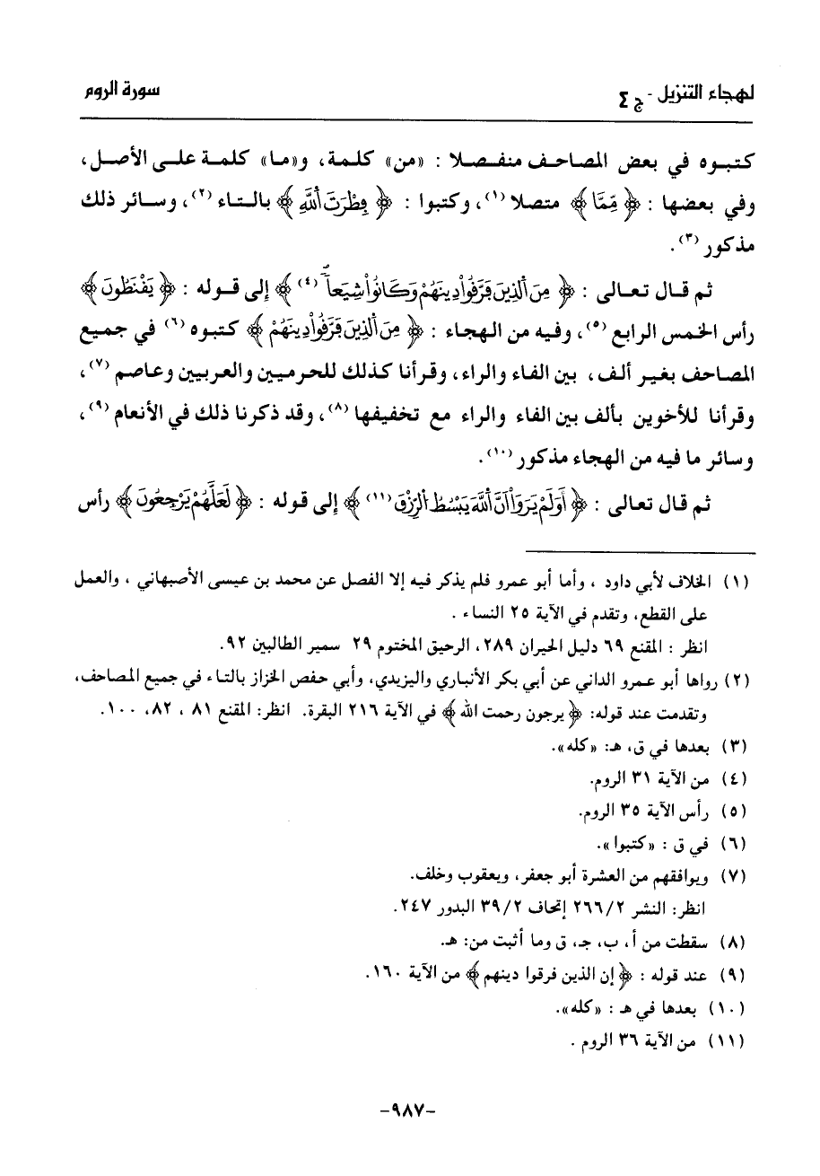 كتبوه في بعض المصاحف منفصلا: «من» كلمة، و «ما» كلمة على الأصل، وفي بعضها: مّمّا متصلا (¬1)، وكتبوا: فطرت الله بالتاء (¬2)، وسائر ذلك مذكور (¬3).