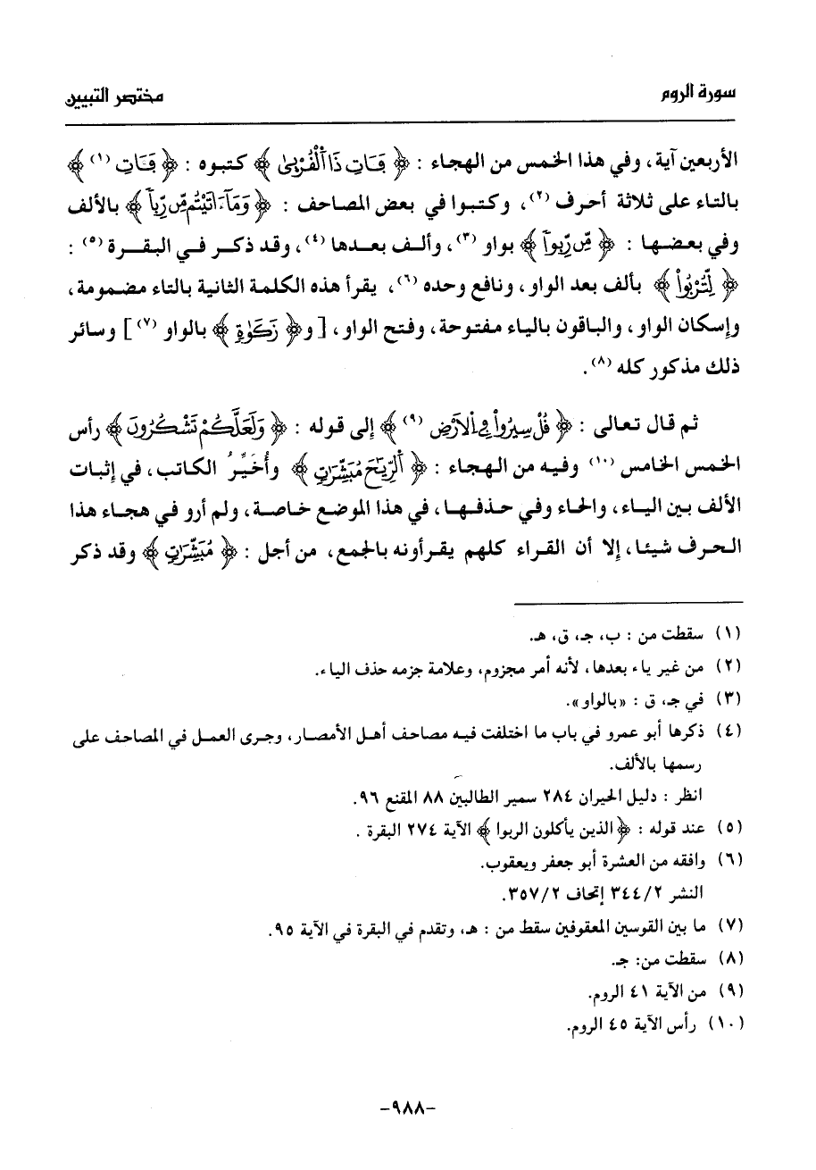 الأربعين آية، وفي هذا الخمس من الهجاء: فئات ذا القربى كتبوه: فئات (¬1) بالتاء على ثلاثة أحرف (¬2)، وكتبوا في بعض المصاحف: وما ءاتيتم مّن رّبا بالألف وفي بعضها: مّن رّبوا بواو (¬3)، وألف بعدها (¬4)، وقد ذكر في البقرة (¬5):