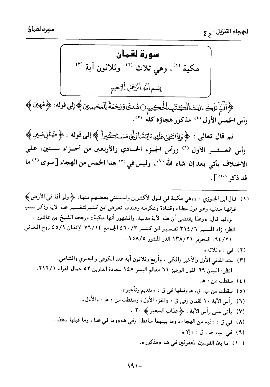 بسم الله الرّحمن الرّحيم ألمّ تلك ءايت الكتب الحكيم* هدى ورحمة لّلمحسنين إلى قوله: مّهين رأس الخمس الأول (¬4) مذكور هجاؤه كله (¬5).