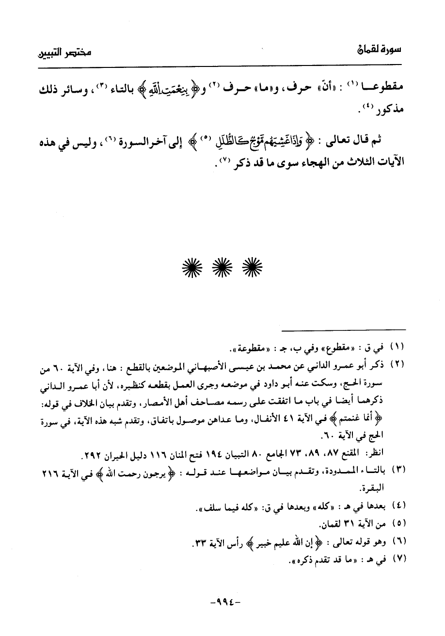 مقطوعا (¬1): «أنّ» حرف، و «ما» حرف (¬2) وبنعمت الله بالتاء (¬3)، وسائر ذلك مذكور (¬4).
