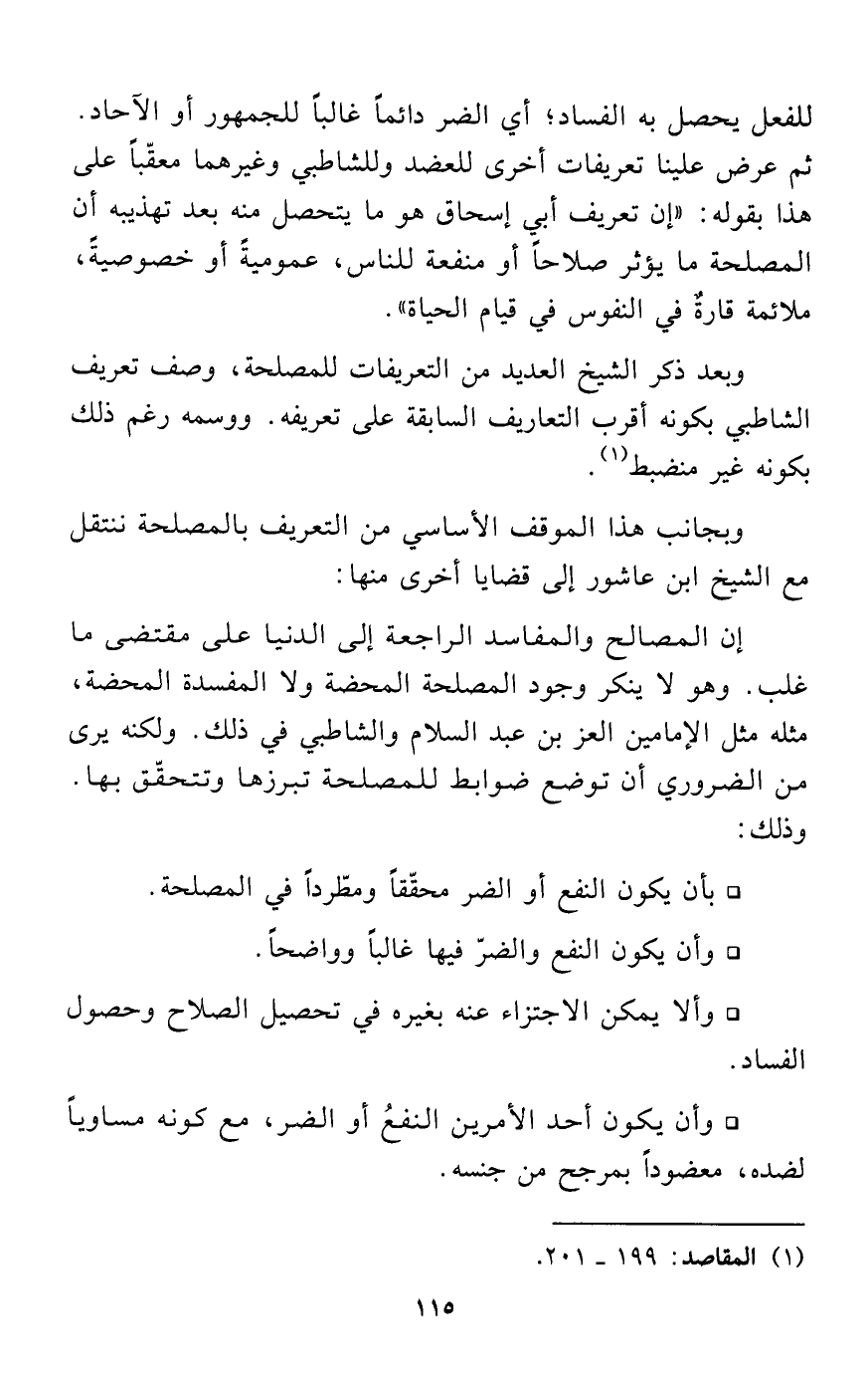 للفعل يحصل به الفساد؛ أي الضر دائماً غالباً للجمهور أو الآحاد. ثم عرض علينا تعريفات أخرى للعضد وللشاطبي وغيرهما معقّباً على هذا بقوله: "إن تعريف أبي إسحاق هو ما يتحصل منه بعد تهذيبه أن المصلحة ما يؤثر صلاحاً أو منفعة للناس، عموميةً أو خصوصيةً، ملائمة قارةٌ في النفوس في قيام الحياة".