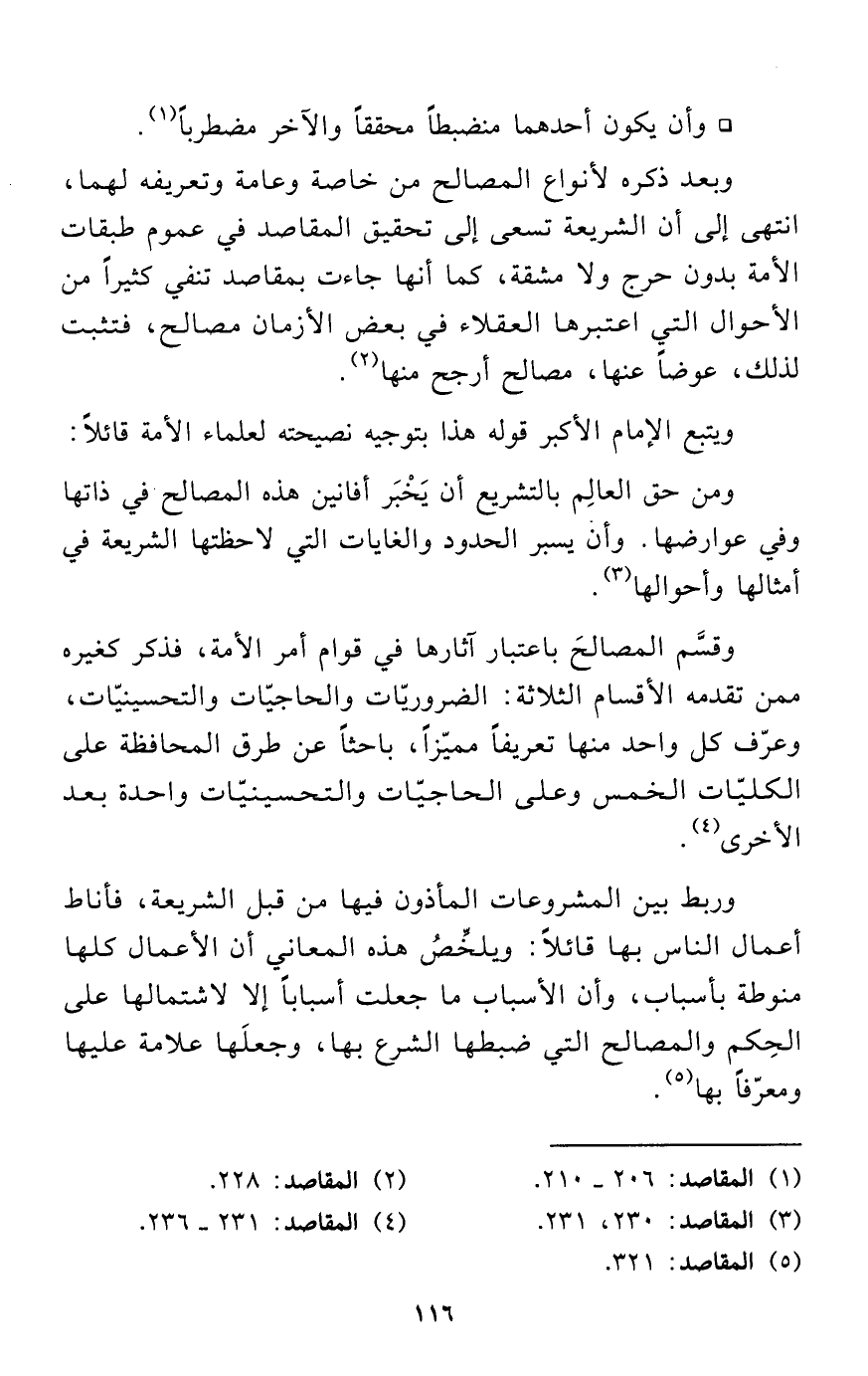وبعد ذكره لأنواع المصالح من خاصة وعامة وتعريفه لهما، انتهى إلى أن الشريعة تسعى إلى تحقيق المقاصد في عموم طبقات الأمة بدون حرج ولا مشقة، كما أنها جاءت بمقاصد تنفي كثيراً من الأحوال التي اعتبرها العقلاء في بعض الأزمان مصالح، فتثبت لذلك، عوضاً عنها، مصالح أرجح منها (¬2).