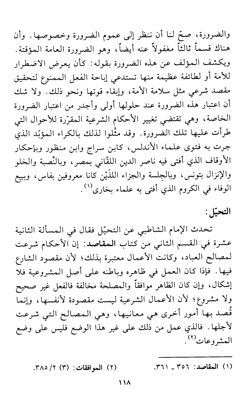 والضرورة، صحّ لنا أن ننظر إلى عموم الضرورة وخصوصها. وأن هناك قسماً ثالثاً مغفولاً عنه أيضاً، وهو الضرورة العامة المؤقتة. ويكشف المؤلف عن هذه الضرورة بقوله: كأن يعرض الاضطرار للأمة أو لطائفة عظيمة منها تستدعي إباحة الفعل الممنوع لتحقيق مقصد شرعي مثل سلامة الأمة، وإبقاء قوتها ونحو ذلك. ولا شك أن اعتبار هذه الضرورة عند حلولها أولى وأجدر من اعتبار الضرورة الخاصة، وهي تقتضي تغيير الأحكام الشرعية المقرّرة للأحوال التي طرأت عليها تلك الضرورة. وقد مثَّلوا لذلك بالكراء المؤبّد الذي جرت به فتوى علماء الأندلس، كابن سراج وابن منظور وبإحكار الأوقاف الذي أفتى فيه ناصر الدين اللقّاني بمصر، وبالنِّصبة والخلو والإنزال بتونس، وبالجِلسة والجزاء اللذَيْن كانا معروفين بفاس، وببيع الوفاء في الكروم الذي أفتى به علماء بخارى (¬1).