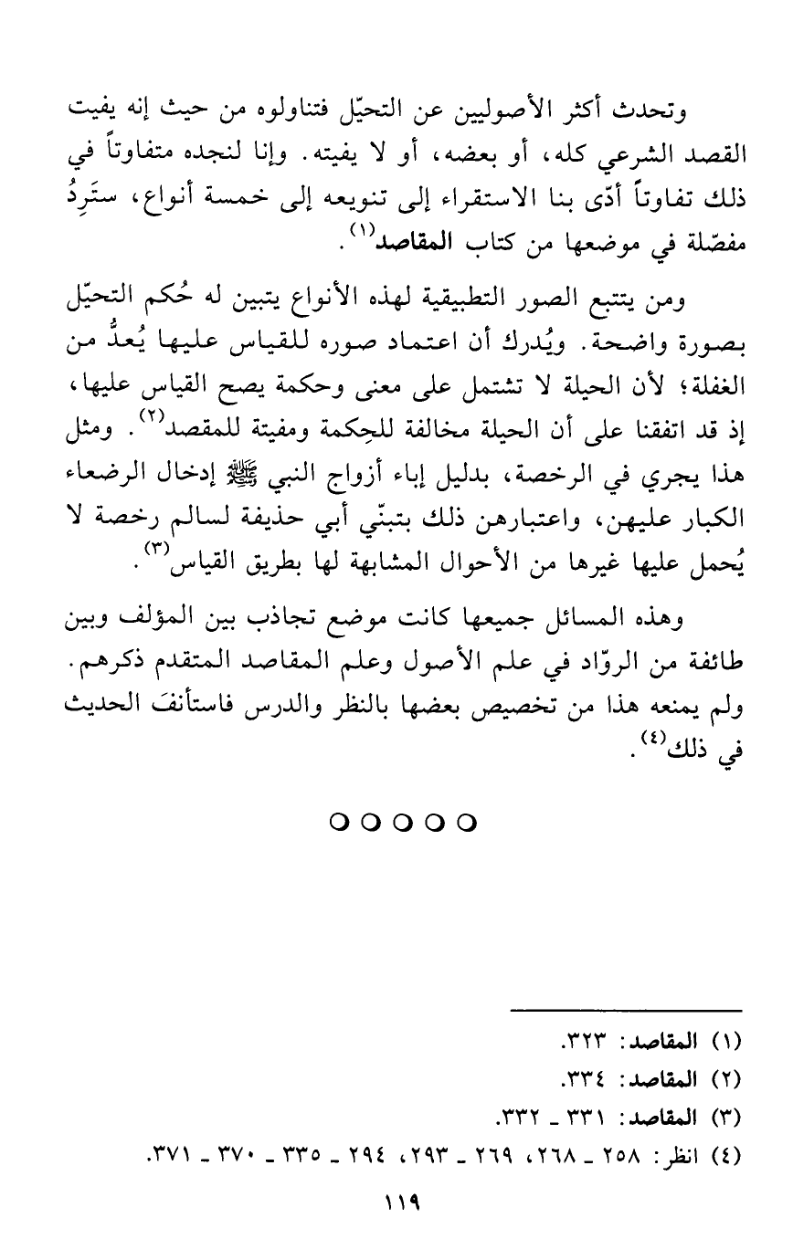وتحدث أكثر الأصوليين عن التحيّل فتناولوه من حيث إنه يفيت القصد الشرعي كله، أو بعضه، أو لا يفيته. وإنا لنجده متفاوتاً في ذلك تفاوتاً أدّى بنا الاستقراء إلى تنويعه إلى خمسة أنواع، ستَرِدُ مفصّلة في موضعها من كتاب المقاصد (¬1).