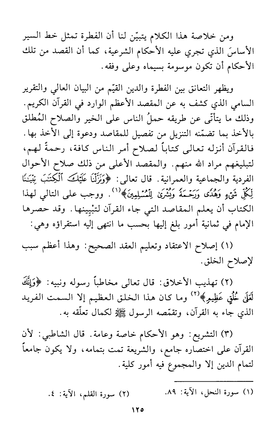 ويظهر التعانق بين الفطرة والدين القيّم من البيان العالي والتقرير السامي الذي كشف به عن المقصد الأعظم الوارد في القرآن الكريم. وذلك ما يتأتّى عن طريقه حملُ الناس على الخير والصلاح المُطلق بالأخذ بما تضمّنه التنزيل من تفصيل للمقاصد ودعوة إلى الأخذ بها. فالقرآن أنزله تعالى كتاباً لصلاح أمر الناس كافة، رحمةً لهم، لتبليغهم مراد الله منهم. والمقصد الأعلى من ذلك صلاح الأحوال الفردية والجماعية والعمرانية. قال تعالى: {وَنَزَّلْنَا عَلَيْكَ الْكِتَابَ تِبْيَانًا لِكُلِّ شَيْءٍ وَهُدًى وَرَحْمَةً وَبُشْرَى لِلْمُسْلِمِينَ} (¬1). ووجب على التالي لهذا الكتاب أن يعلم المقاصد التي جاء القرآن لتبْيِينها. وقد حصرها الإمام في ثمانية أمور بلغ إليها بحسب ما انتهى إليه استقراؤه وهي: