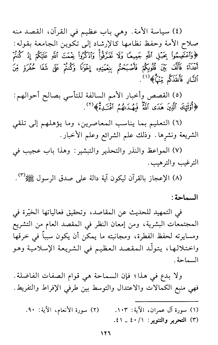 (4) سياسة الأمة. وهي باب عظيم في القرآن، القصد منه صلاح الأمة وحفظ نظامها كالإرشاد إلى تكوين الجامعة بقوله: {وَاعْتَصِمُوا بِحَبْلِ اللَّهِ جَمِيعًا وَلَا تَفَرَّقُوا وَاذْكُرُوا نِعْمَتَ اللَّهِ عَلَيْكُمْ إِذْ كُنْتُمْ أَعْدَاءً فَأَلَّفَ بَيْنَ قُلُوبِكُمْ فَأَصْبَحْتُمْ بِنِعْمَتِهِ إِخْوَانًا وَكُنْتُمْ عَلَى شَفَا حُفْرَةٍ مِنَ النَّارِ فَأَنْقَذَكُمْ مِنْهَا} (¬1).