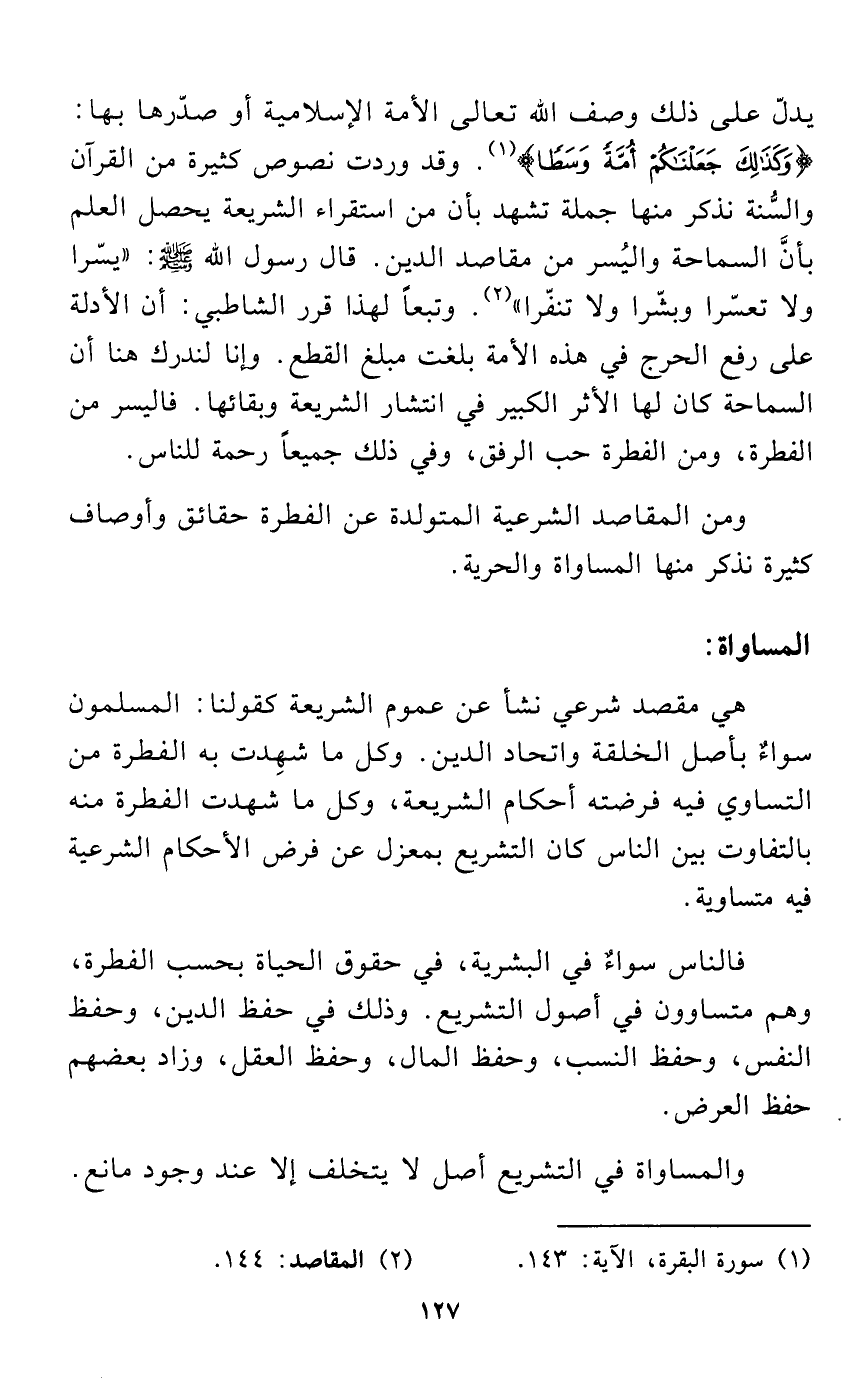 ومن المقاصد الشرعية المتولدة عن الفطرة حقائق وأوصاف كثيرة نذكر منها المساواة والحرية.