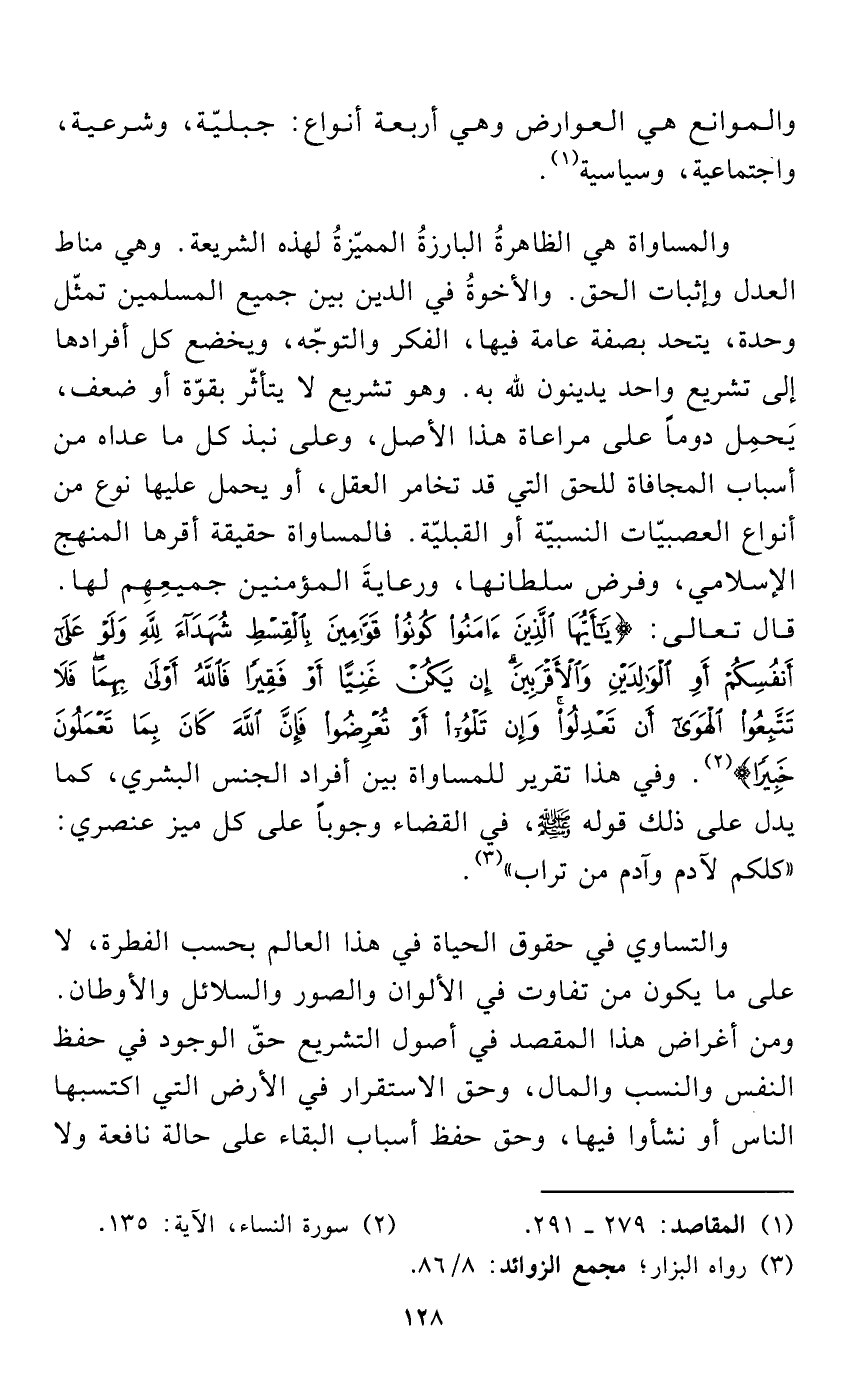 والمساواة هي الظاهرةُ البارزةُ المميّزةُ لهذه الشريعة. وهي مناط العدل وإثبات الحق. والأخوةُ في الدين بين جميع المسلمين تمثّل وحدة، يتحد بصفة عامة فيها، الفكر والتوجّه، ويخضع كل أفرادها إلى تشريع واحد يدينون لله به. وهو تشريع لا يتأثّر بقوّة أو ضعف، يَحمِل دوماً على مراعاة هذا الأصل، وعلى نبذ كل ما عداه من أسباب المجافاة للحق التي قد تخامر العقل، أو يحمل عليها نوع من أنواع العصبيّات النسبيّة أو القبليّة. فالمساواة حقيقة أقرها المنهج الإسلامي، وفرض سلطانها، ورعايةَ المؤمنين جميعِهِم لها. قال تعالى: {يَا أَيُّهَا الَّذِينَ آمَنُوا كُونُوا قَوَّامِينَ بِالْقِسْطِ شُهَدَاءَ لِلَّهِ وَلَوْ عَلَى أَنْفُسِكُمْ أَوِ الْوَالِدَيْنِ وَالْأَقْرَبِينَ إِنْ يَكُنْ غَنِيًّا أَوْ فَقِيرًا فَاللَّهُ أَوْلَى بِهِمَا فَلَا تَتَّبِعُوا الْهَوَى أَنْ تَعْدِلُوا وَإِنْ تَلْوُوا أَوْ تُعْرِضُوا فَإِنَّ اللَّهَ كَانَ بِمَا تَعْمَلُونَ خَبِيرًا} (¬2). وفي هذا تقرير للمساواة بين أفراد الجنس البشري، كما يدل على ذلك قوله - صلى الله عليه وسلم -، في القضاء وجوباً على كل ميز عنصري: "كلكم لآدم وآدم من تراب" (¬3).