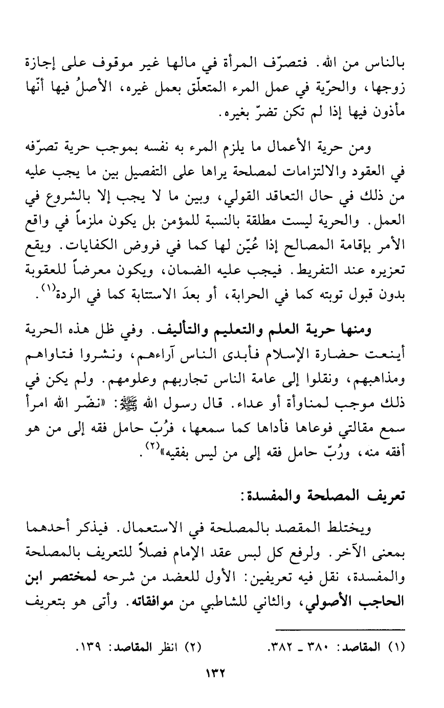 ومنها حرية العلم والتعليم والتأليف. وفي ظل هذه الحرية أينعت حضارة الإسلام فأبدى الناس آراءهم، ونشروا فتاواهم ومذاهبهم، ونقلوا إلى عامة الناس تجاربهم وعلومهم. ولم يكن في ذلك موجب لمناوأة أو عداء. قال رسول الله - صلى الله عليه وسلم -: "نضّر الله امرأ سمع مقالتي فوعاها فأداها كما سمعها، فرُبّ حامل فقه إلى من هو أفقه منه، ورُبّ حامل فقه إلى من ليس بفقيه" (¬2).