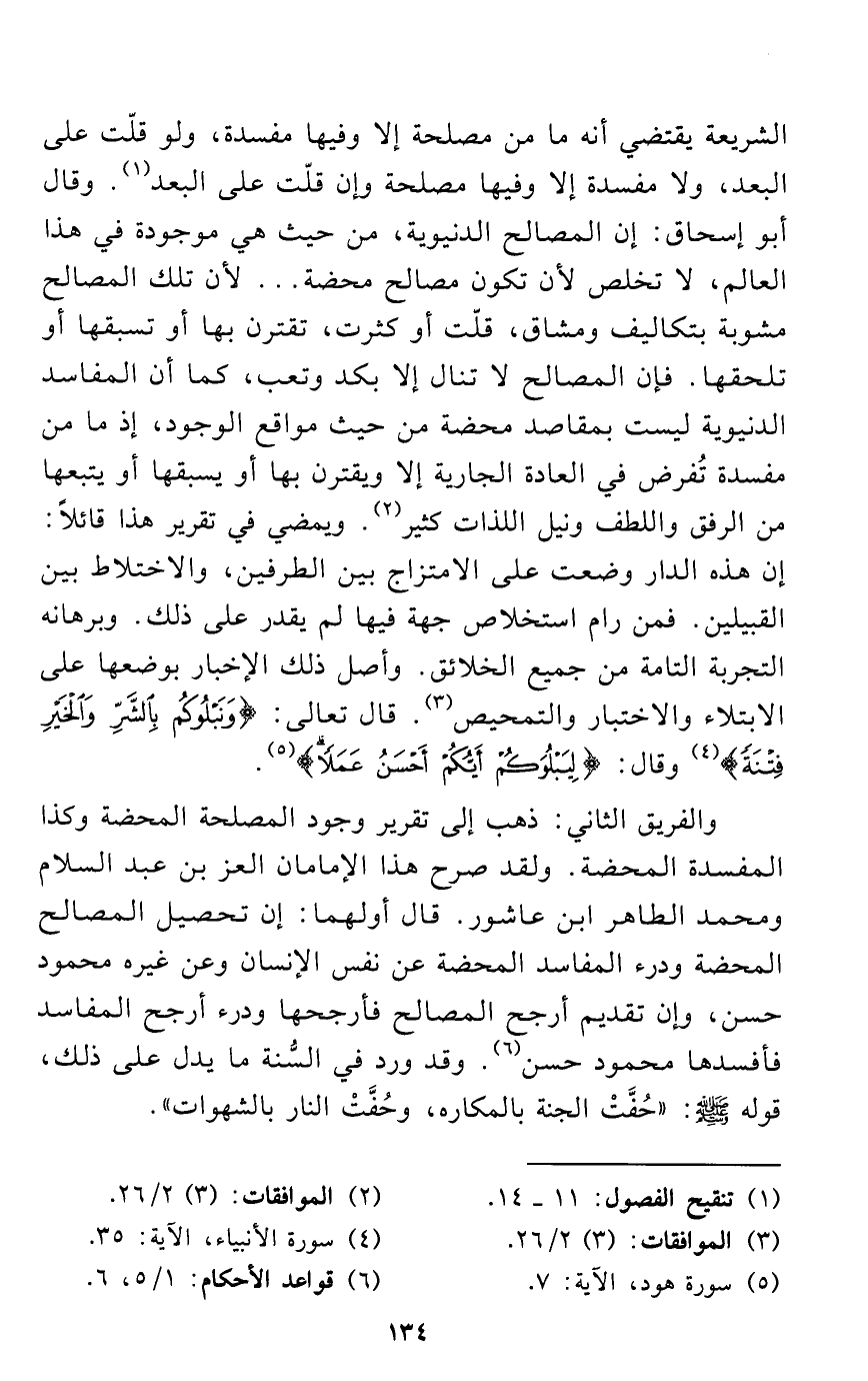والفريق الثاني: ذهب إلى تقرير وجود المصلحة المحضة وكذا المفسدة المحضة. ولقد صرح هذا الإمامان العز بن عبد السلام ومحمد الطاهر ابن عاشور. قال أولهما: إن تحصيل المصالح المحضة ودرء المفاسد المحضة عن نفس الإنسان وعن غيره محمود حسن، وإن تقديم أرجح المصالح فأرجحها ودرء أرجح المفاسد فأفسدها محمود حسن (¬6). وقد ورد في السُّنة ما يدل على ذلك، قوله - صلى الله عليه وسلم -: "حُفَّتْ الجنة بالمكاره، وحُفَّتْ النار بالشهوات".