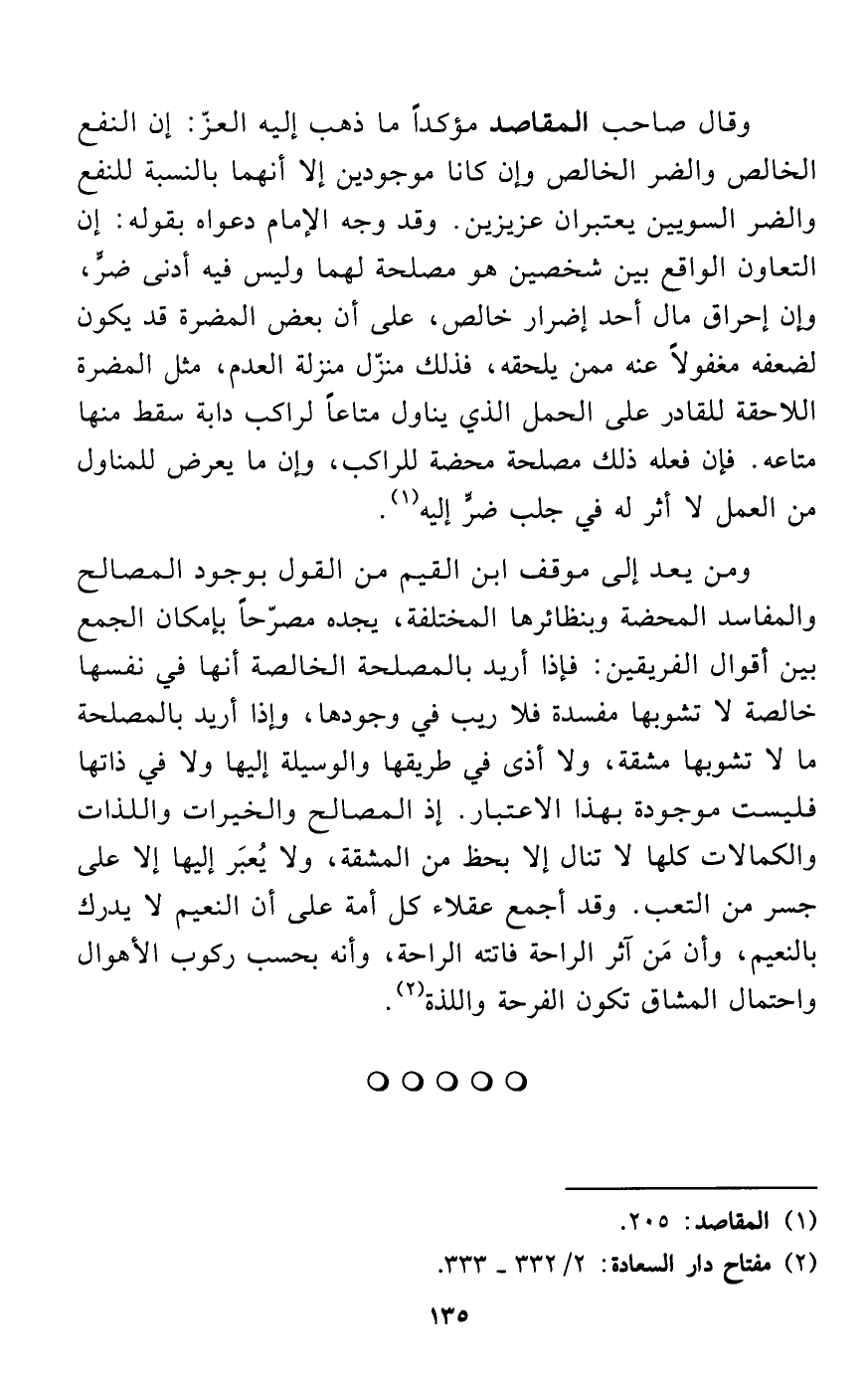 ومن يعد إلى موقف ابن القيم من القول بوجود المصالح والمفاسد المحضة وبنظائرها المختلفة، يجده مصرّحاً بإمكان الجمع بين أقوال الفريقين: فإذا أريد بالمصلحة الخالصة أنها في نفسها خالصة لا تشوبها مفسدة فلا ريب في وجودها، وإذا أريد بالمصلحة ما لا تشوبها مشقة، ولا أذى في طريقها والوسيلة إليها ولا في ذاتها فليست موجودة بهذا الاعتبار. إذ المصالح والخيرات واللذات والكمالات كلها لا تنال إلا بحظ من المشقة، ولا يُعبَر إليها إلا على جسر من التعب. وقد أجمع عقلاء كل أمة على أن النعيم لا يدرك بالنعيم، وأن مَن آثر الراحة فاتته الراحة، وأنه بحسب ركوب الأهوال واحتمال المشاق تكون الفرحة واللذة (¬2).