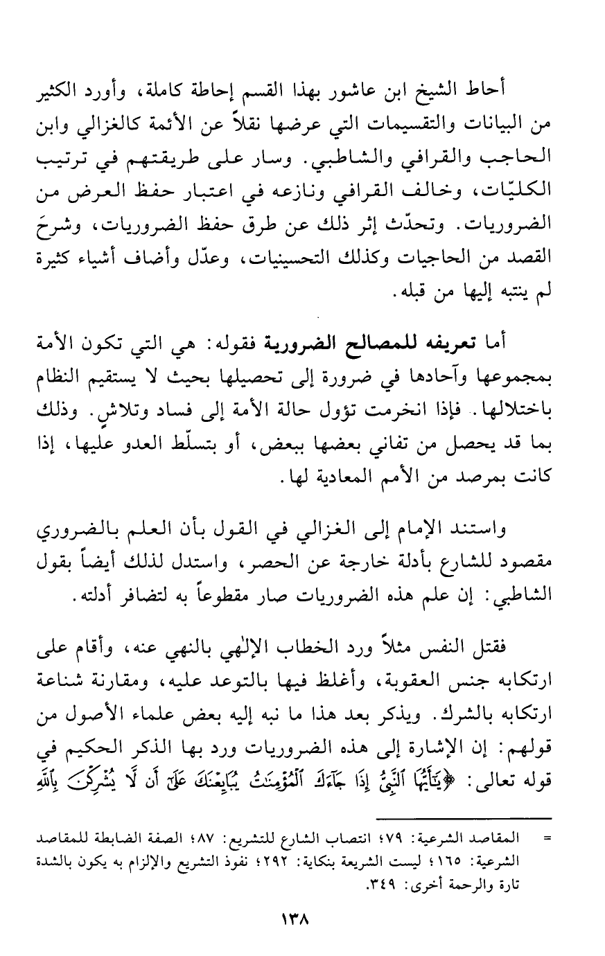 أما تعريفه للمصالح الضرورية فقوله: هي التي تكون الأمة بمجموعها وآحادها في ضرورة إلى تحصيلها بحيث لا يستقيم النظام باختلالها. فإذا انخرمت تؤول حالة الأمة إلى فساد وتلاش. وذلك بما قد يحصل من تفاني بعضها ببعض، أو بتسلط العدو عليها، إذا كانت بمرصد من الأمم المعادية لها.