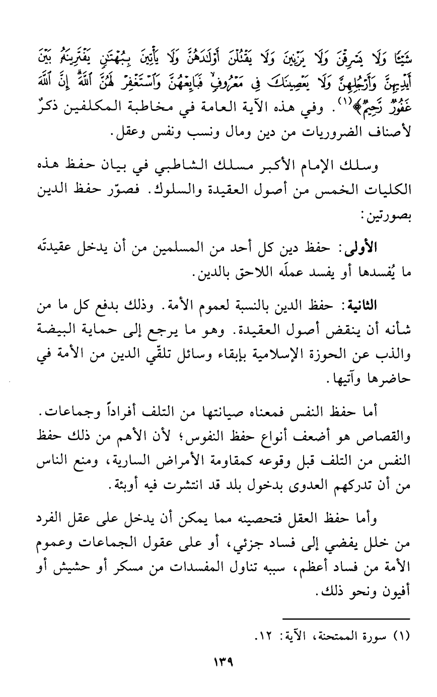 شَيْئًا وَلَا يَسْرِقْنَ وَلَا يَزْنِينَ وَلَا يَقْتُلْنَ أَوْلَادَهُنَّ وَلَا يَأْتِينَ بِبُهْتَانٍ يَفْتَرِينَهُ بَيْنَ أَيْدِيهِنَّ وَأَرْجُلِهِنَّ وَلَا يَعْصِينَكَ فِي مَعْرُوفٍ فَبَايِعْهُنَّ وَاسْتَغْفِرْ لَهُنَّ اللَّهَ إِنَّ اللَّهَ غَفُورٌ رَحِيمٌ} (¬1). وفي هذه الآية العامة في مخاطبة المكلفين ذكرٌ لأصناف الضروريات من دين ومال ونسب ونفس وعقل.