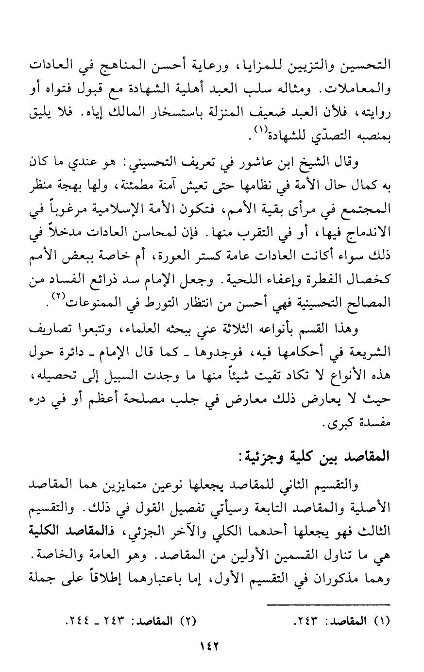 التحسين والتزيين للمزايا، ورعاية أحسن المناهج في العادات والمعاملات. ومثاله سلب العبد أهلية الشهادة مع قبول فتواه أو روايته، فلأن العبد ضعيف المنزلة باستسخار المالك إياه. فلا يليق بمنصبه التصدّي للشهادة (¬1).