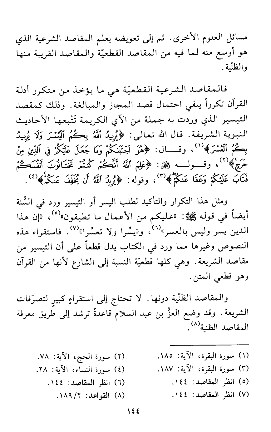 فالمقاصد الشرعية القطعيّة هي ما يؤخذ من متكرر أدلة القرآن تكرراً ينفي احتمال قصد المجاز والمبالغة. وذلك كمقصد التيسير الذي وردت به جملة من الآي الكريمة تَتْبعها الأحاديث النبوية الشريفة. قال الله تعالى: {يُرِيدُ اللَّهُ بِكُمُ الْيُسْرَ وَلَا يُرِيدُ بِكُمُ الْعُسْر} (¬1)، وقال: {هُوَ اجْتَبَاكُمْ وَمَا جَعَلَ عَلَيْكُمْ فِي الدِّينِ مِنْ حَرَجٍ} (¬2)، وقوله - عز وجل -: {عَلِمَ اللَّهُ أَنَّكُمْ كُنْتُمْ تَخْتَانُونَ أَنْفُسَكُمْ فَتَابَ عَلَيْكُمْ وَعَفَا عَنْكُمْ} (¬3)، وقوله: {يُرِيدُ اللَّهُ أَنْ يُخَفِّفَ عَنْكُمْ} (¬4).