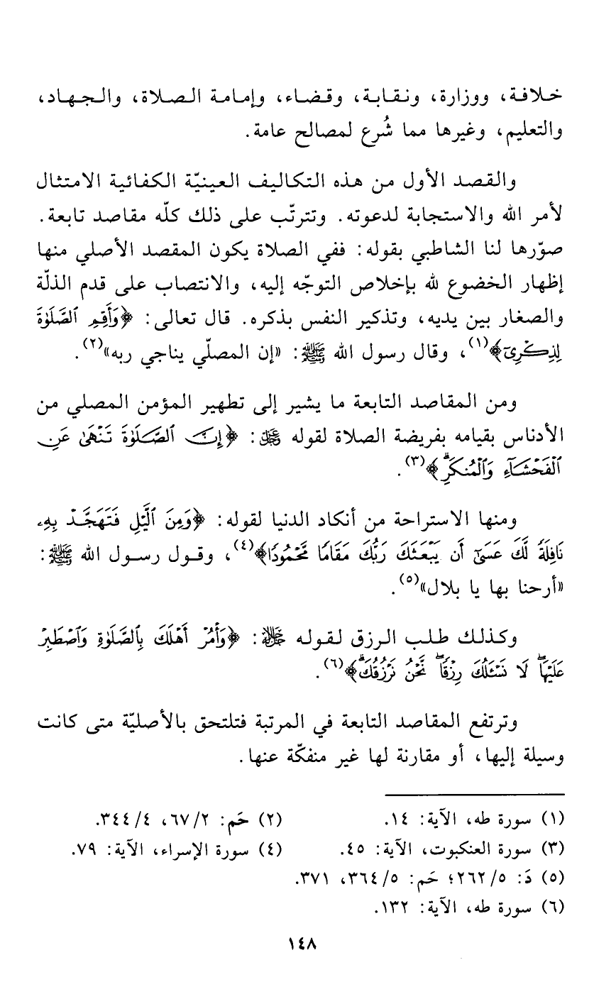 والقصد الأول من هذه التكاليف العينيّة الكفائية الامتثال لأمر الله والاستجابة لدعوته. وتترتّب على ذلك كلّه مقاصد تابعة. صوّرها لنا الشاطبي بقوله: ففي الصلاة يكون المقصد الأصلي منها إظهار الخضوع لله بإخلاص التوجّه إليه، والانتصاب على قدم الذلّة والصغار بين يديه، وتذكير النفس بذكره. قال تعالى: {وَأَقِمِ الصَّلَاةَ لِذِكْرِي} (¬1)، وقال رسول الله - صلى الله عليه وسلم -: "إن المصلّي يناجي ربه" (¬2).