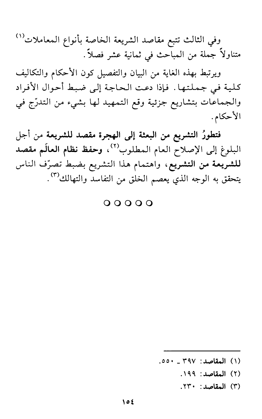 فتطورُ التشريع من البعثة إلى الهجرة مقصد للشريعة من أجل البلوغ إلى الإصلاح العام المطلوب (¬2)، وحفظ نظام العالَم مقصد للشريعة من التشريع، واهتمام هذا التشريع بضبط تصرّف الناس يتحقق به الوجه الذي يعصم الخلق من التفاسد والتهالك (¬3).