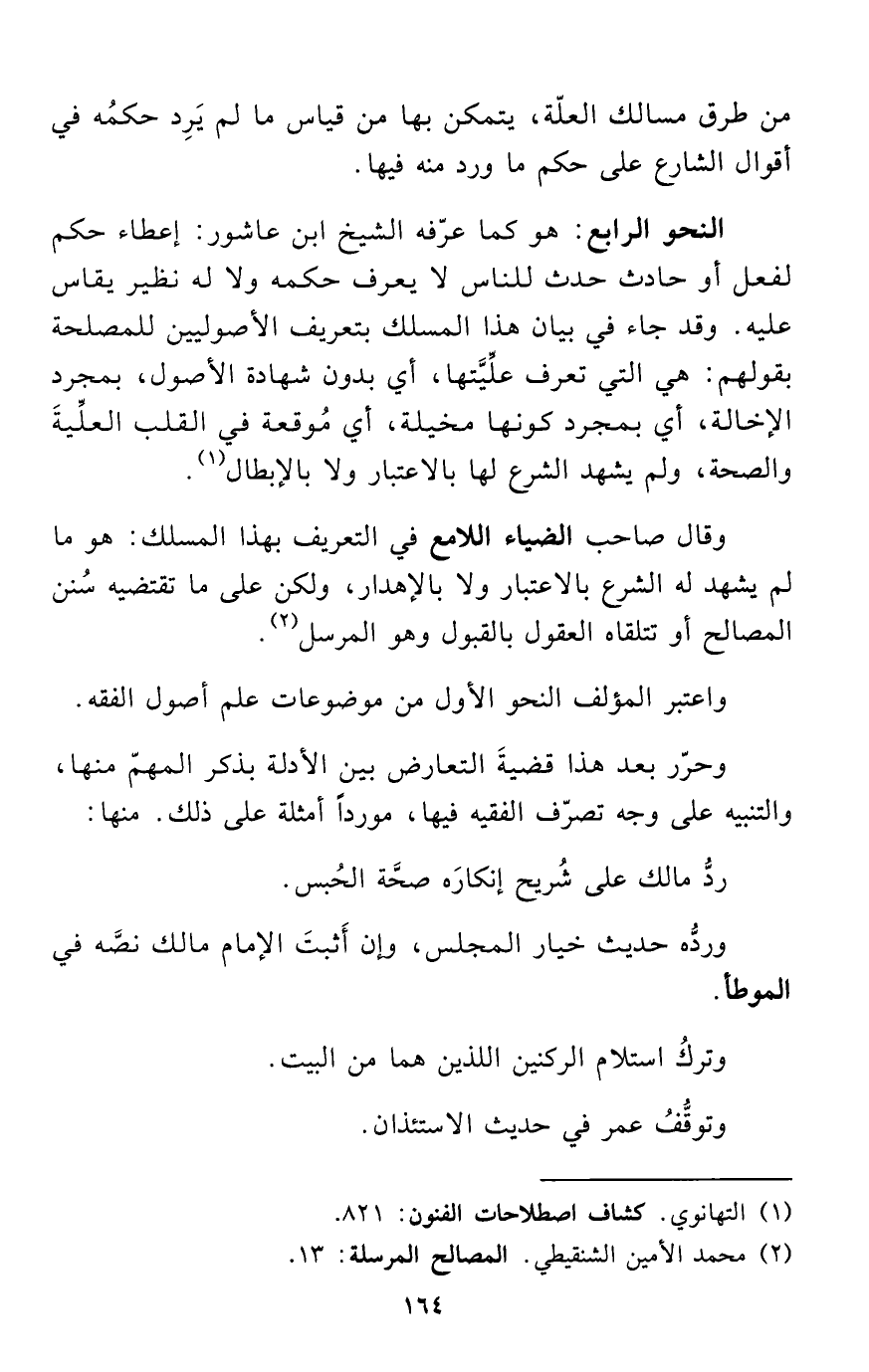 النحو الرابع: هو كما عرّفه الشيخ ابن عاشور: إعطاء حكم لفعل أو حادث حدث للناس لا يعرف حكمه ولا له نظير يقاس عليه. وقد جاء في بيان هذا المسلك بتعريف الأصوليين للمصلحة بقولهم: هي التي تعرف علِّيَّتها، أي بدون شهادة الأصول، بمجرد الإخالة، أي بمجرد كونها مخيلة، أي مُوقعة في القلب العلَّيةَ والصحة، ولم يشهد الشرع لها بالاعتبار ولا بالإبطال (¬1).