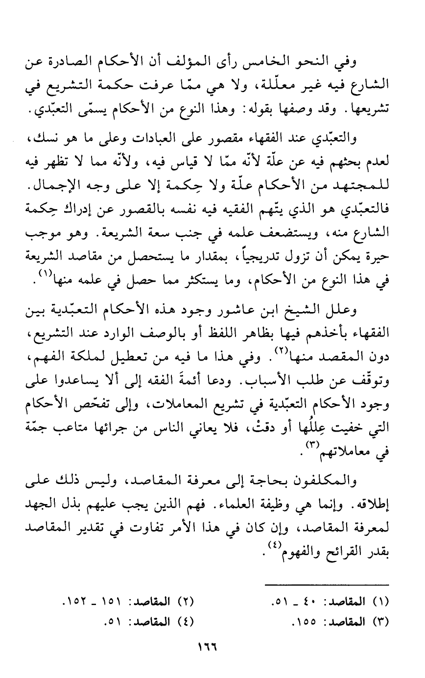 وفي النحو الخامس رأى المؤلف أن الأحكام الصادرة عن الشارع فيه غير معلّلة، ولا هي ممّا عرفت حكمة التشريع في تشريعها. وقد وصفها بقوله: وهذا النوع من الأحكام يسمّى التعبّدي.