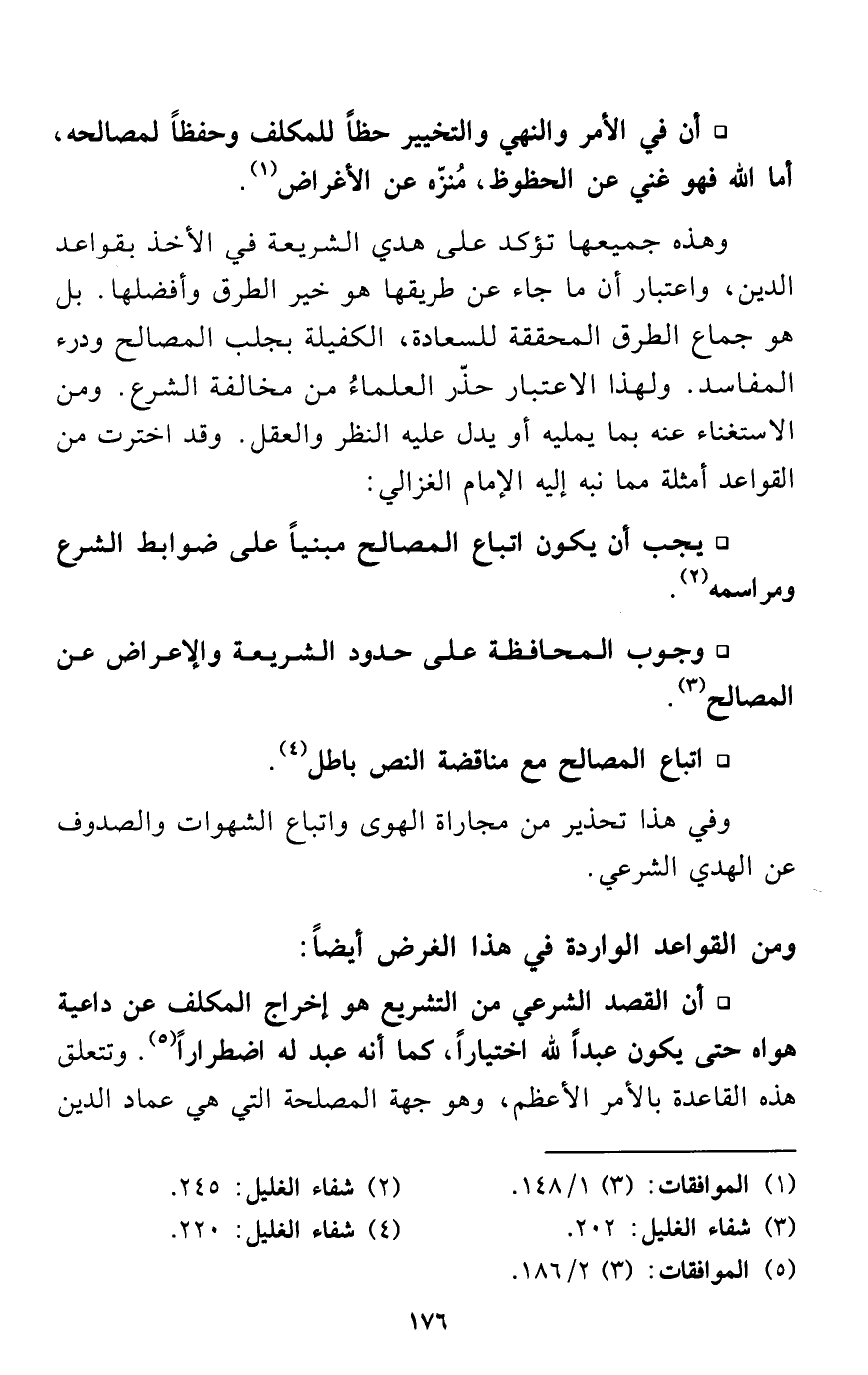 وهذه جميعها تؤكد على هدي الشريعة في الأخذ بقواعد الدين، واعتبار أن ما جاء عن طريقها هو خير الطرق وأفضلها. بل هو جماع الطرق المحققة للسعادة، الكفيلة بجلب المصالح ودرء المفاسد. ولهذا الاعتبار حذّر العلماءُ من مخالفة الشرع. ومن الاستغناء عنه بما يمليه أو يدل عليه النظر والعقل. وقد اخترت من القواعد أمثلة مما نبه إليه الإمام الغزالي:
