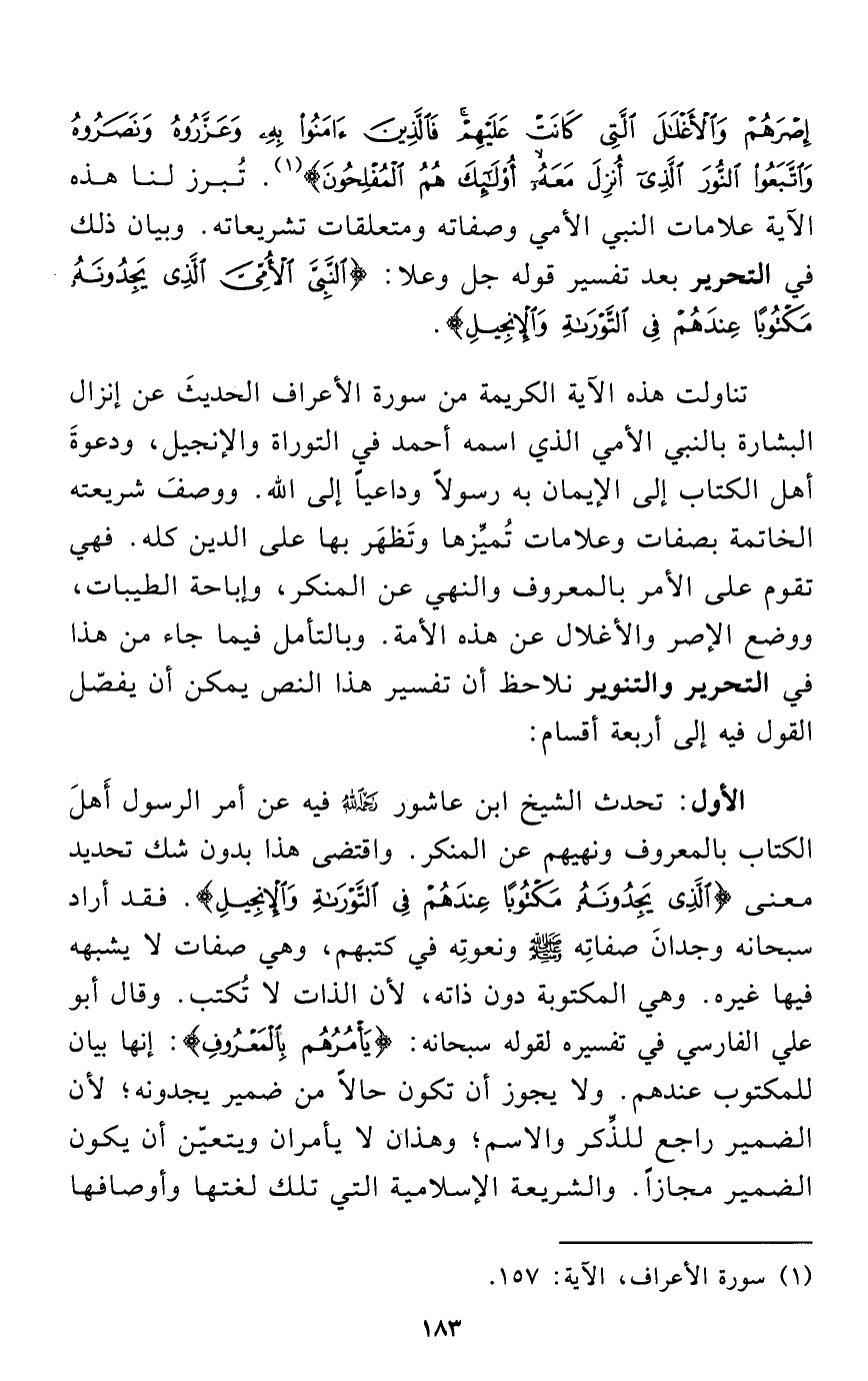 تناولت هذه الآية الكريمة من سورة الأعراف الحديثَ عن إنزال البشارة بالنبي الأمي الذي اسمه أحمد في التوراة والإنجيل، ودعوةَ أهل الكتاب إلى الإيمان به رسولاً وداعياً إلى الله. ووصفَ شريعته الخاتمة بصفات وعلامات تُميَّزها وتَظهَر بها على الدين كله. فهي تقوم على الأمر بالمعروف والنهي عن المنكر، وإباحة الطيبات، ووضع الإصر والأغلال عن هذه الأمة. وبالتأمل فيما جاء من هذا في التحرير والتنوير نلاحظ أن تفسير هذا النص يمكن أن يفصّل القول فيه إلى أربعة أقسام: