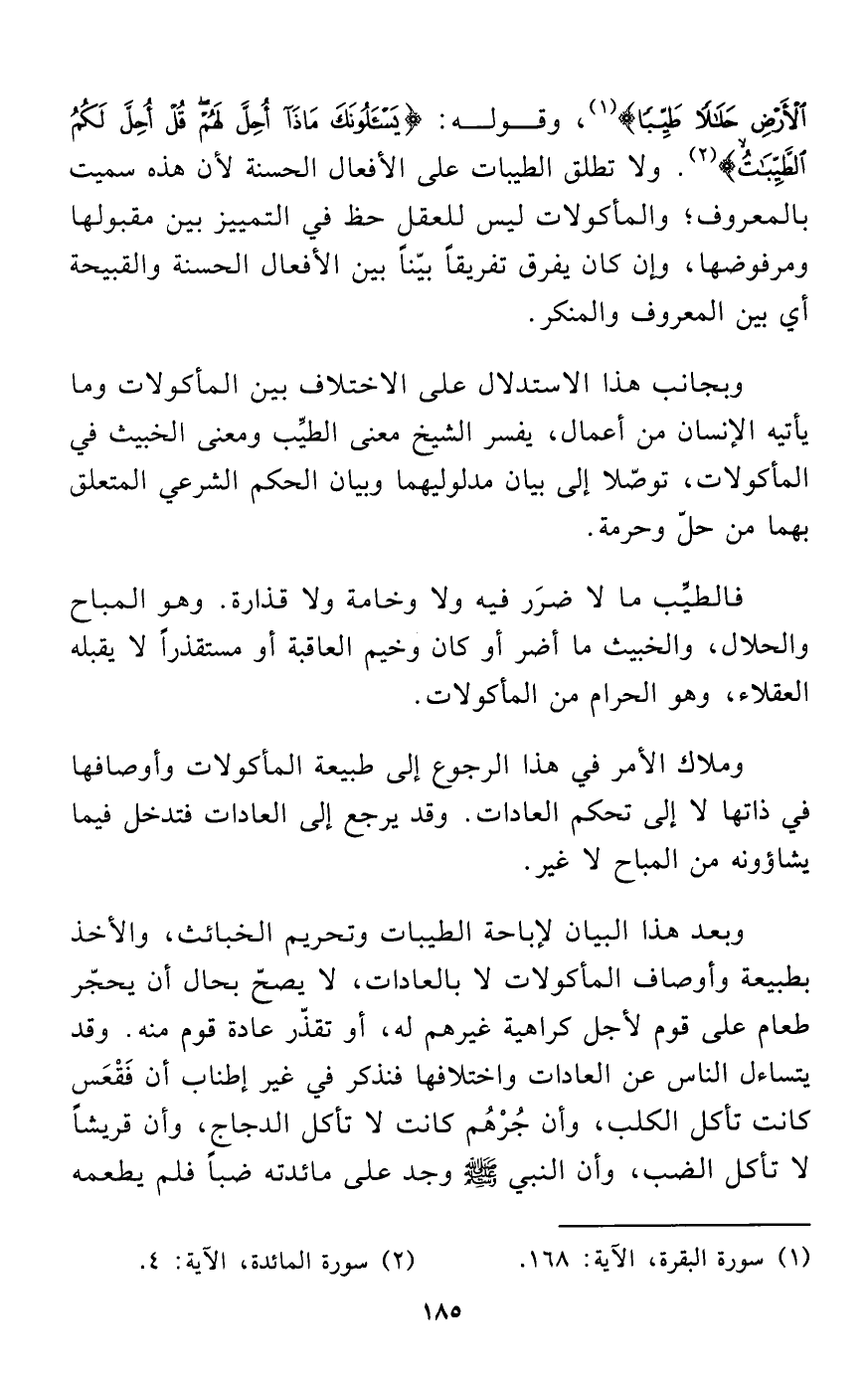 فِي الْأَرْضِ حَلَالًا طَيِّبًا} (¬1)، وقوله: {يَسْأَلُونَكَ مَاذَا أُحِلَّ لَهُمْ قُلْ أُحِلَّ لَكُمُ الطَّيِّبَاتُ} (¬2). ولا تطلق الطيبات على الأفعال الحسنة لأن هذه سميت بالمعروف؛ والمأكولات ليس للعقل حظ في التمييز بين مقبولها ومرفوضها، وإن كان يفرق تفريقاً بيّناً بين الأفعال الحسنة والقبيحة أي بين المعروف والمنكر.